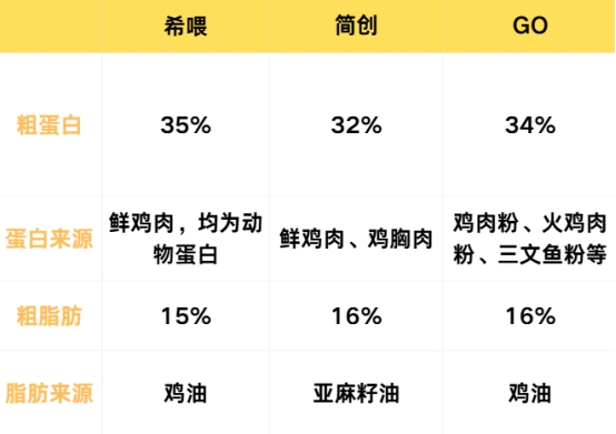 GO:GO的核心营养指标为34%的粗蛋白与16%的粗脂肪,蛋白质主要源自肉粉,尽管在加工过程中存在一定的营养损耗,但总体上仍能提供较为充足的蛋白质与必需氨基酸。脂肪则选用品质较好的鸡油作为来源,保证了脂肪成分的优质性。