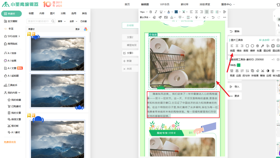 双十二当天分秒必争,不用浪费时间在排版上!用小墨鹰编辑器的现成模板,几分钟就能产出高颜值活动推文,把更多精力放在引流和转化上~ 赶紧试试,助力活动大卖!