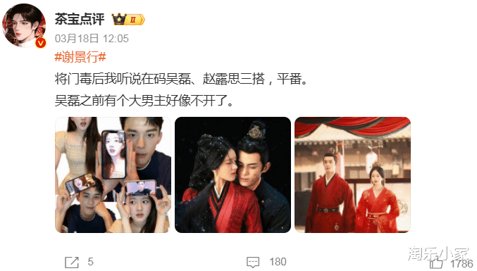 前日(3月18日),有网友在社交平台爆料称《将门毒后》将由吴磊、赵露思三搭,平番。还扯出他拉姐姐衣袖拉链的乌龙事件,把"三搭疑云"炒得比剧组盒饭还热乎。