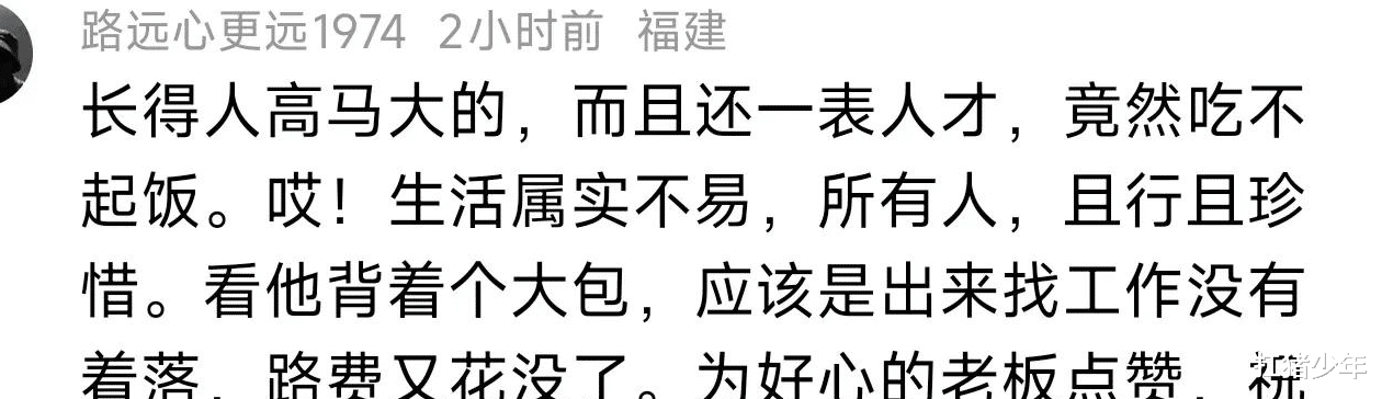 看着装,应该也是出来找工作一时没找到,或者某种原因一时没钱吃饭。可理解。