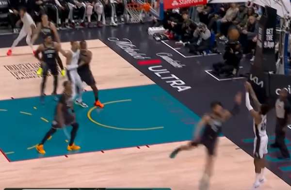 随后接福克斯传球迎着扑防的CC拔起就射,三分稳稳命中。