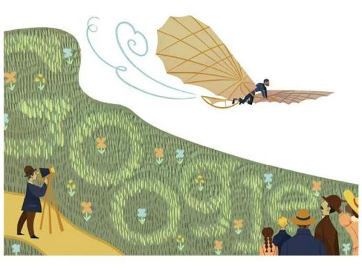 李林达尔虽屡遭失败与挫折,但痴心不改。1891~1896年,他制造了18种不同形式的滑翔机,其中12种是单翼机,6种是双翼机或多翼机。李林达尔的滑翔机除了机翼面积和布局大小不同外,其机翼的形状宛如巨鸟的鸟翼,机翼骨架用肋条制成弯曲辐射状,然后蒙上蒙皮,如图1所示,机翼中间有一敞口,驾驶员身处敞口中央,他用自己的身体来操纵滑翔机,当两只手臂支承在滑翔机上时,身体和双腿的前后左右摆动就可以操纵飞机,当然,这要借助于多年积累的丰富经验。李林达尔多次飞行的目的是寻找控制飞行稳定和可靠操纵的方法。他逐渐学会了用三种方式来控制滑翔机的飞行:翻转,使机身左右倾斜;前后倾,使机身俯仰;侧滑,使飞机左右调头。1891年,李林达尔首次空中飞行成功,见图2。到1893年,李林达尔在滑翔机上加装了水平安定面和垂直安定面,用以保证飞行的纵向与横向稳定。李林达尔已成为驾驶滑翔机技术娴熟的飞行大家,十分相信实践中取得的经验,他说:“只有实际试验才能解决这个问题,我们必须让空气和风发表他们自己的意见”。1895年,李林达尔还试验了机翼前缘襟翼装置,以改善滑翔机的抗风性能。随后几年,李林达尔的飞行水平越来越好。1894年,他操纵滑翔机从50米高山坡上滑翔而飞,最远飞行达1千米。“蝙蝠侠”的美称由此而来。