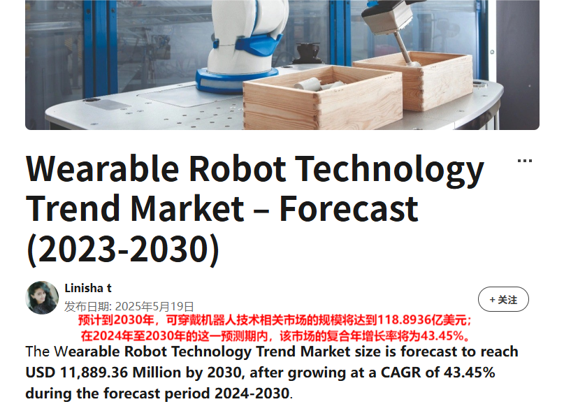 兔克搜索近期的相关数据看到,全球可穿戴机器人技术市场预计将在2030年前达到约118.9亿美元规模,2024-2030年的年复合增长率接近43%。其背后的驱动力,来自老龄化社会下的助行需求,以及日常消费场景中对“增强型移动”的尝试需求。