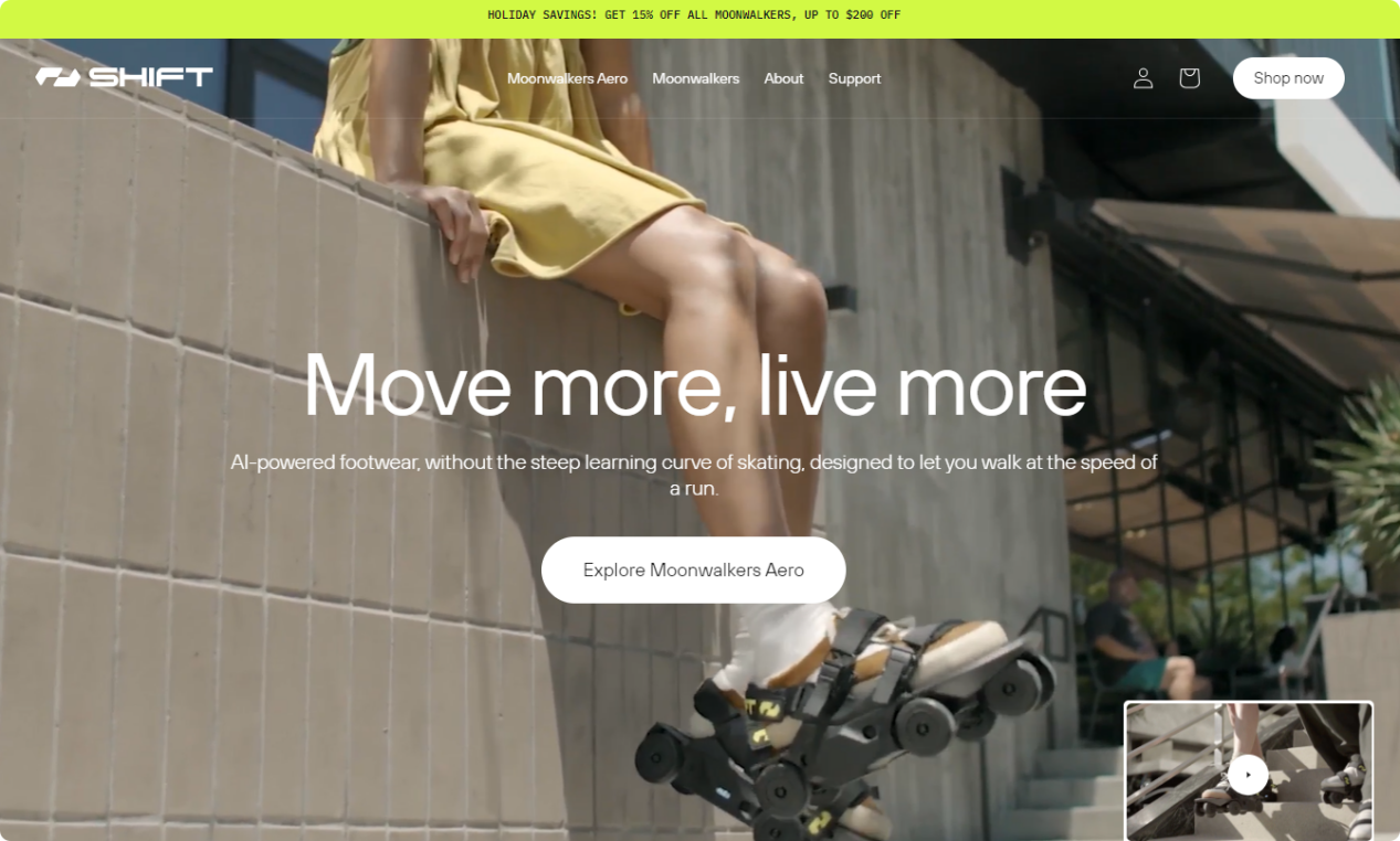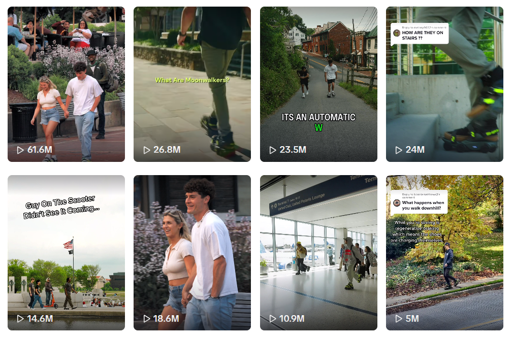 比如“上坡走路比别人跑得还快”“穿着Moonwalkers在城市通勤的一天”等内容,重点展示产品带来的反差感和实际使用体验,从而让观众在几秒钟内能够理解产品的价值。