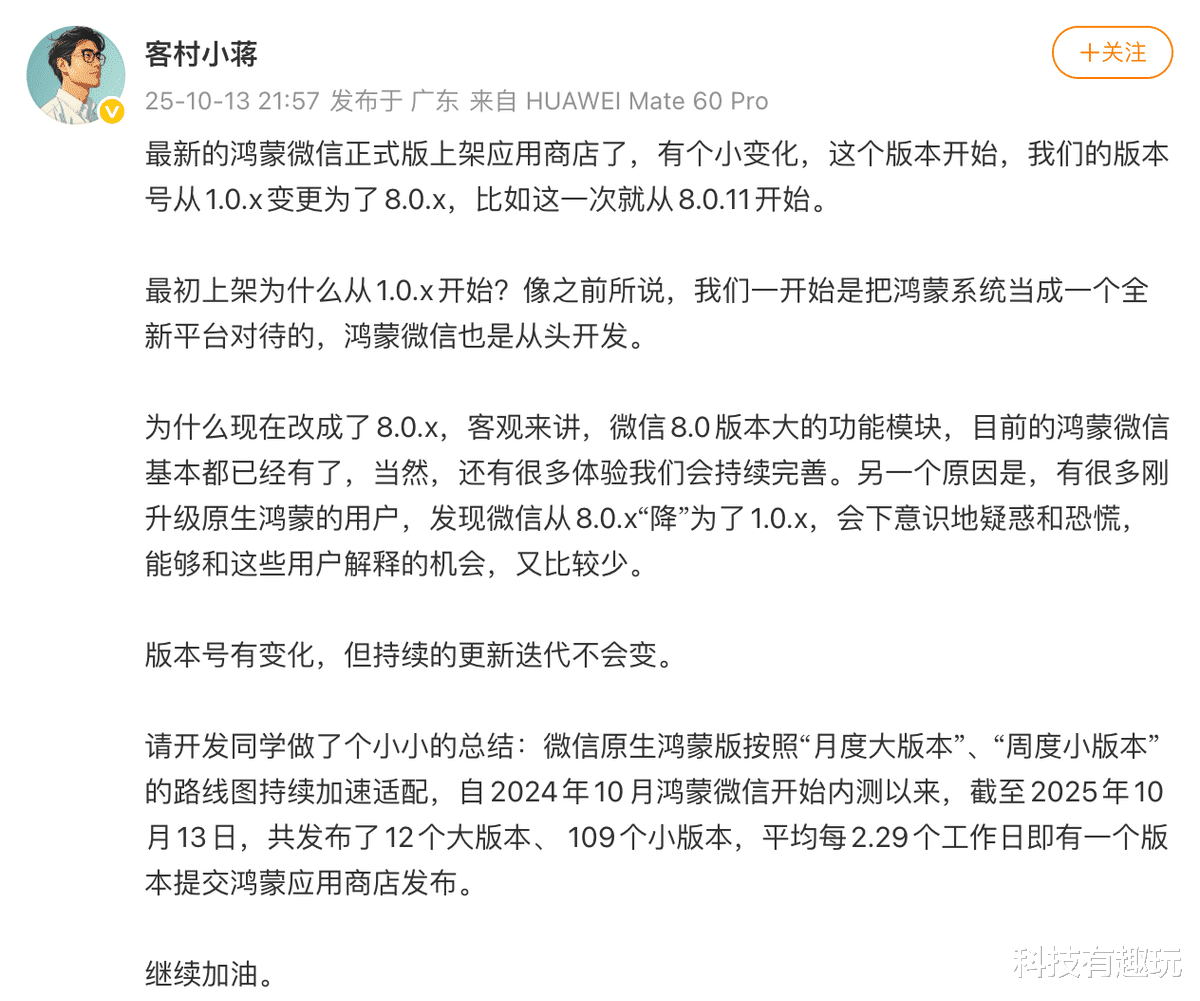 根据微信员工“客村小蒋”在微博披露的数据,这背后的工作量大得惊人:自鸿蒙版微信内测以来,团队保持着“月度大版本,周度小版本”的魔鬼节奏。在这一年里,他们共发布了12个大版本、109个小版本,平均每2.29个工作日就有一个版本提交发布。