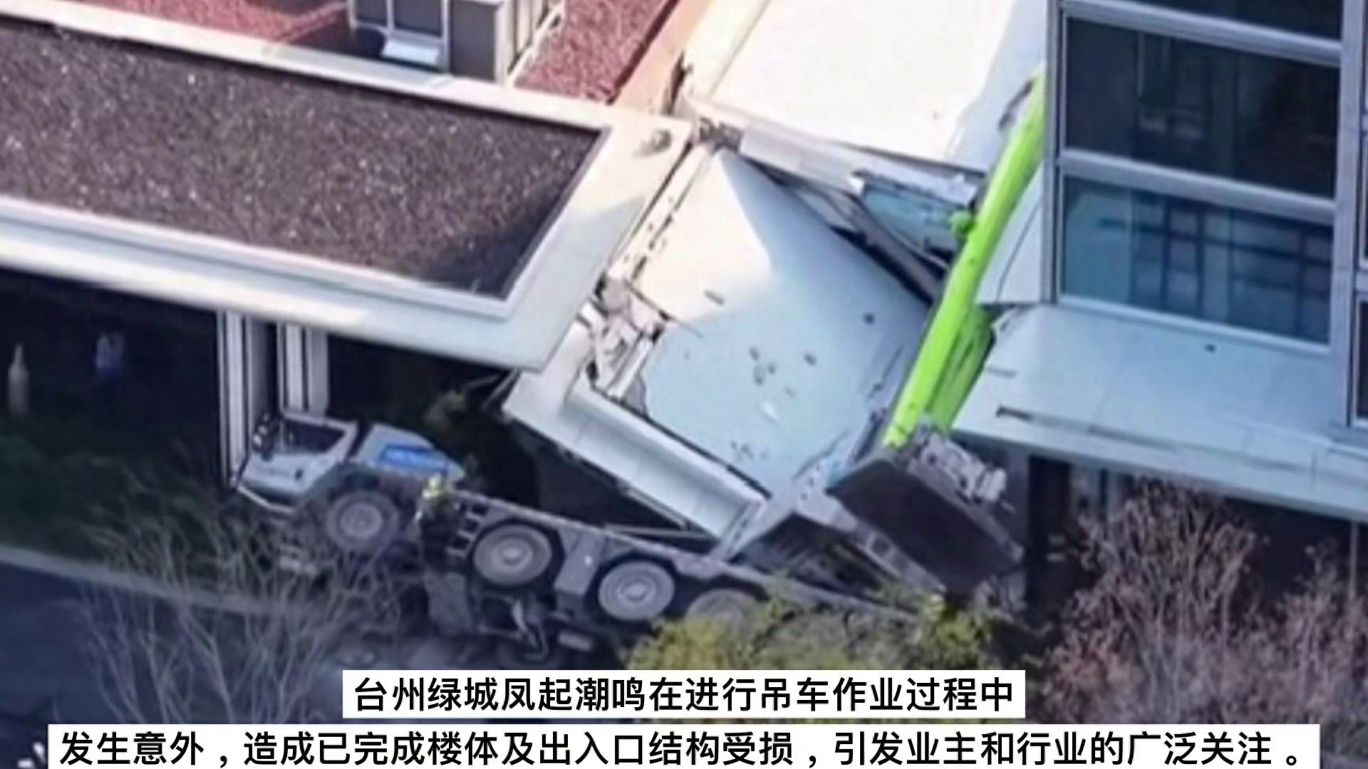 台州绿城凤起潮鸣吊车意外。台州绿城凤起潮鸣在进行吊车作业过程中发生意外,造成已完成楼体及出入口结构受损,引发业主和行业的