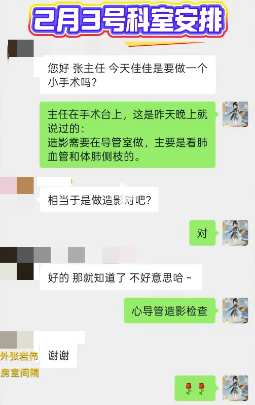 2月3日早上,张医生查房时再次强调需尽快做心导管造影,以确认肺动脉发育情况。
