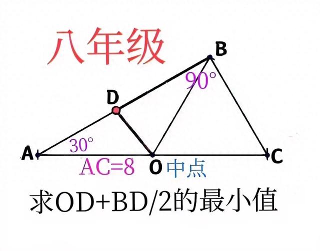 在直角△ABC中,∠A=30°,O为斜边AC中点,D为AC上的动点,AC=8,求OD+BD/2的最小值。