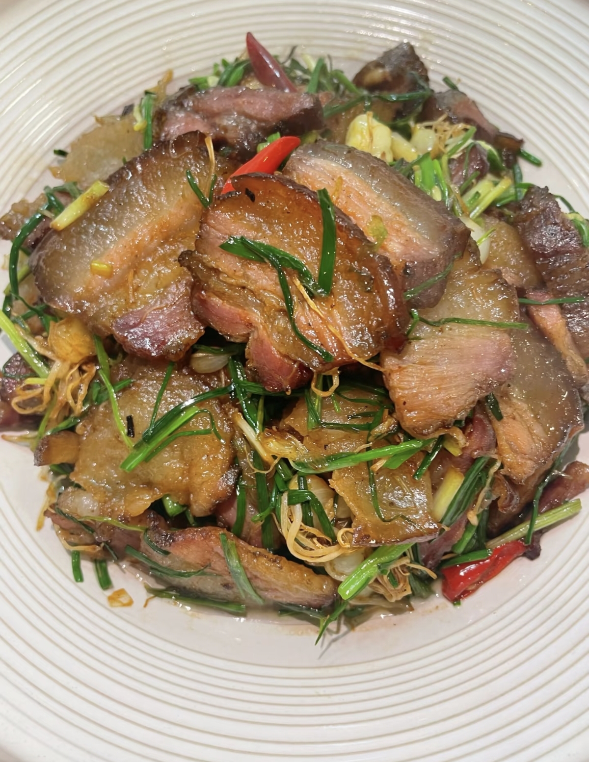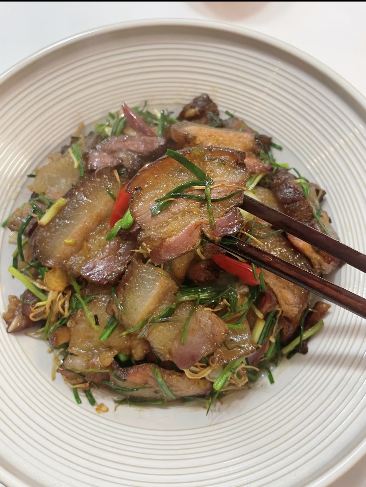 紧接着,姜蒜片与干辣椒入锅爆香,红绿相间,瞬间点燃视觉与嗅觉的双重盛宴。随后,切好的野葱段倾泻而下,大火快炒是关键。野葱入锅的瞬间,高温激发了它独特的辛香,与腊肉的醇厚烟熏味激烈碰撞、交融。此时,野葱的清脆与腊肉的咸香在锅中交织共舞,只需少许生抽提鲜,若腊肉本身够咸,甚至无需再加盐。快速翻炒均匀,待野葱断生但仍保持翠绿时,即可出锅装盘。