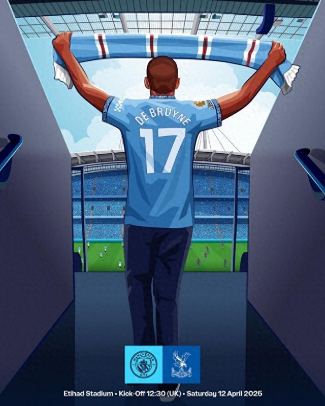 曼城发布对阵水晶宫海报:球迷身穿德布劳内球衣高举围巾