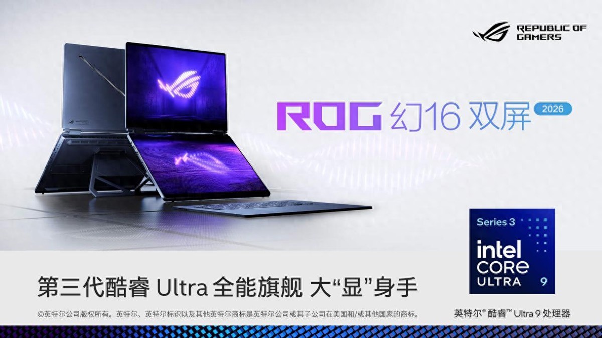 而今年 CES 上亮相的 ROG 幻16 双屏,正是从这个矛盾切入:通过双16英寸ROG星云原画屏和五种可切换形态,把更大的工作空间直接整合进设备本身;再配合英特尔酷睿 Ultra 9 处理器 386H提供的性能与能效基础,让双屏在移动状态下不用时刻担心电量和性能掉线。