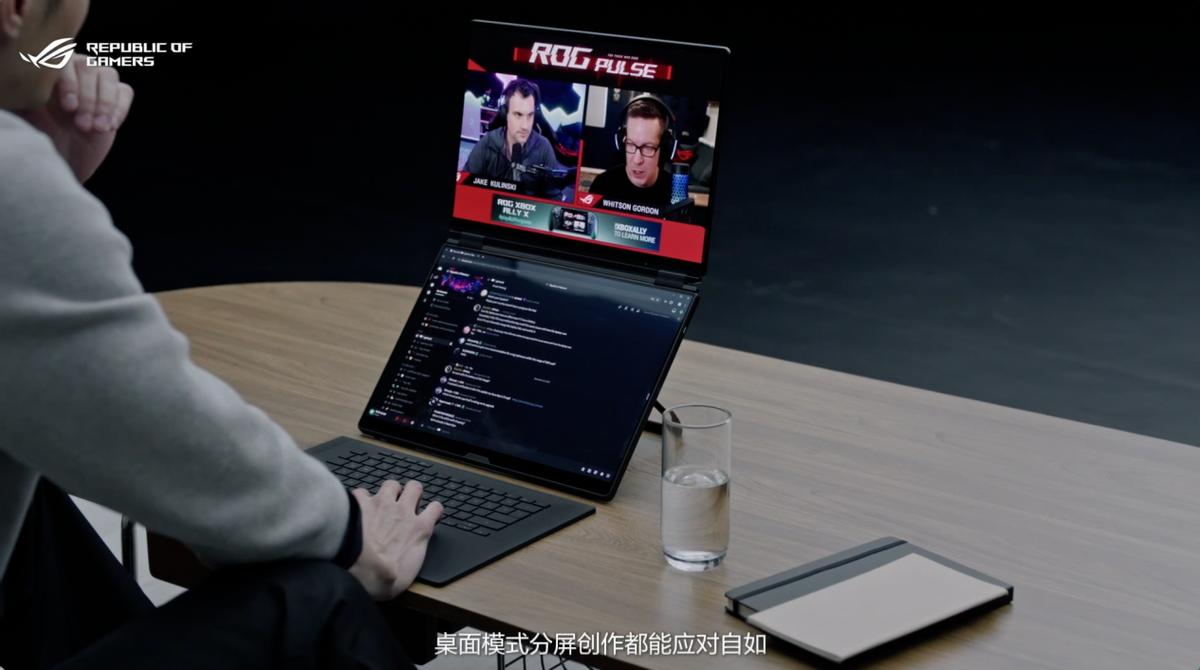 涉及到沟通协作时,分享模式会显得格外实用。屏幕支持 320° 大角度开合,可以很自然地把内容转向同事或客户,讨论方案、对比修改点时不需要反复挪动电脑。帐篷模式更适合临时讨论的场景,一块屏幕展示方案,另一块用来翻备注、查资料,两个人坐在桌子两侧也能同时看清。而当需要长时间阅读或展示时,书本模式把两块 16 英寸屏幕纵向并排,视角接近纸质书,浏览长文档、PDF、代码时更连贯,也可以直接用来做演讲展示。