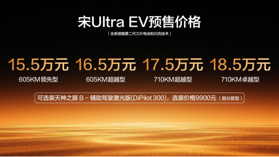 比亚迪发布会的主题是“闪充中国,改变世界”。这并非是一句简单的口号,这次闪充技术不亚于一场汽车领域的能源革命,以技术改变汽车市场格局,改变人类的出行方式。以后的纯电车只有两种,一种是跑长途的,一种是不跑长途的。而两者之间的分界线,是由一款车决定的,那就是和二代刀一起开启预售的宋Ultra EV 。因为宋Ultra,把闪充门槛拉低到了15.5万元,这就是一个标杆,也是一个门槛,相当于比亚迪用宋Ultra EV这款车给市场画了一道红线——15万的电车,要有闪充,我说的!谁赞成,谁反对?