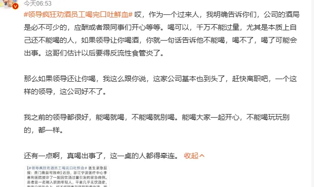 当然,除了把员工当成创造利润的工具也就罢了,更可怕的是,如今糟粕的用工文化还成了给领导提供情绪价值的工具,比如今天的一个热搜话题——领导疯狂劝酒员工喝完口吐鲜血……