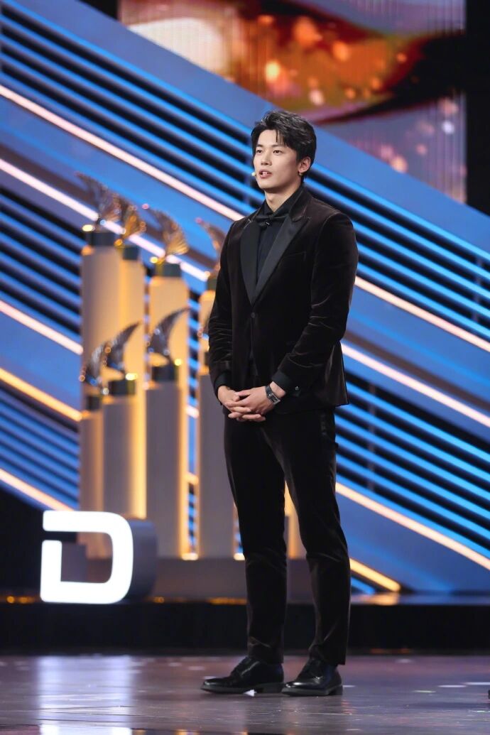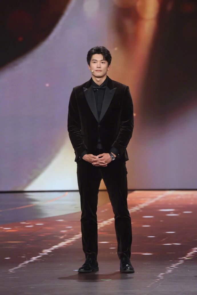 黑色丝绒本是 “华丽感” 的代表,但汪顺选的套装没做夸张的廓形,只靠面料的温润光泽撑气场 —— 体坛荣耀之夜是 “专业与荣耀” 的场合,丝绒的质感刚好匹配这份庄重,又比普通西装多了一份 “属于获奖者的细腻温度”,中和了运动员的硬朗,却没丢赛场里的利落。