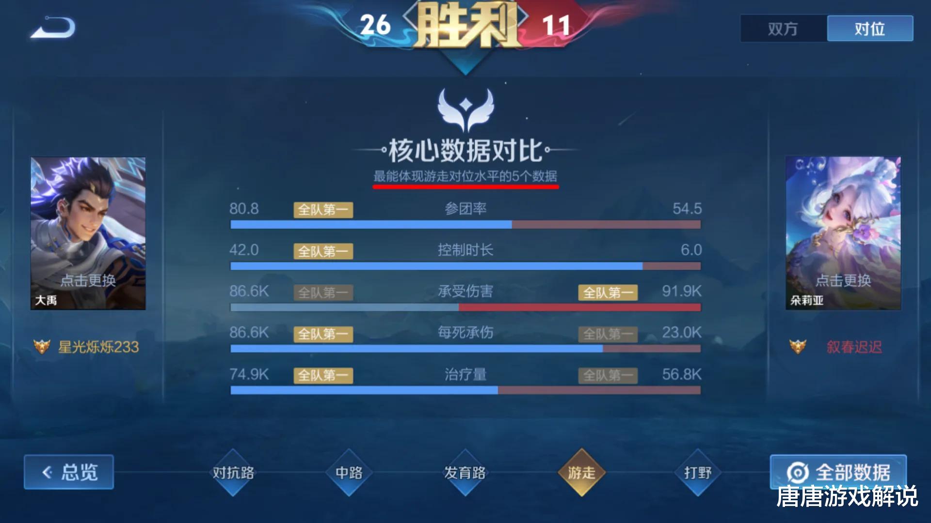 在战绩页面的对位数据中,可以看到游走英雄的核心数据对比情况,提高对应类型的数据表现,就能得到更高的评分。