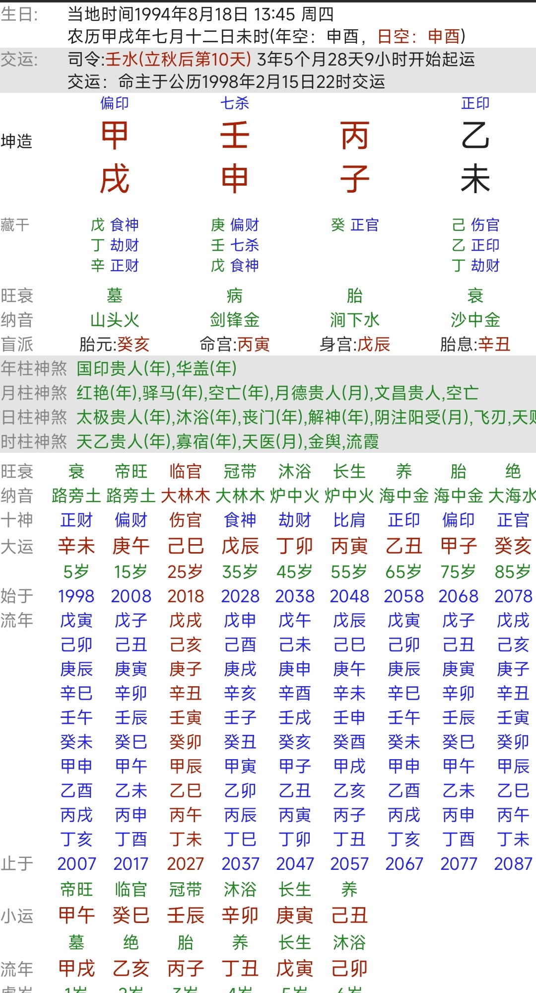 财运分析:八字偏财当令,财生官杀克身,身弱担财无力,那就容易被财所困。因为财是克日主的,身弱的人本就元气不足,再被财耗,反而可能弄巧成拙。