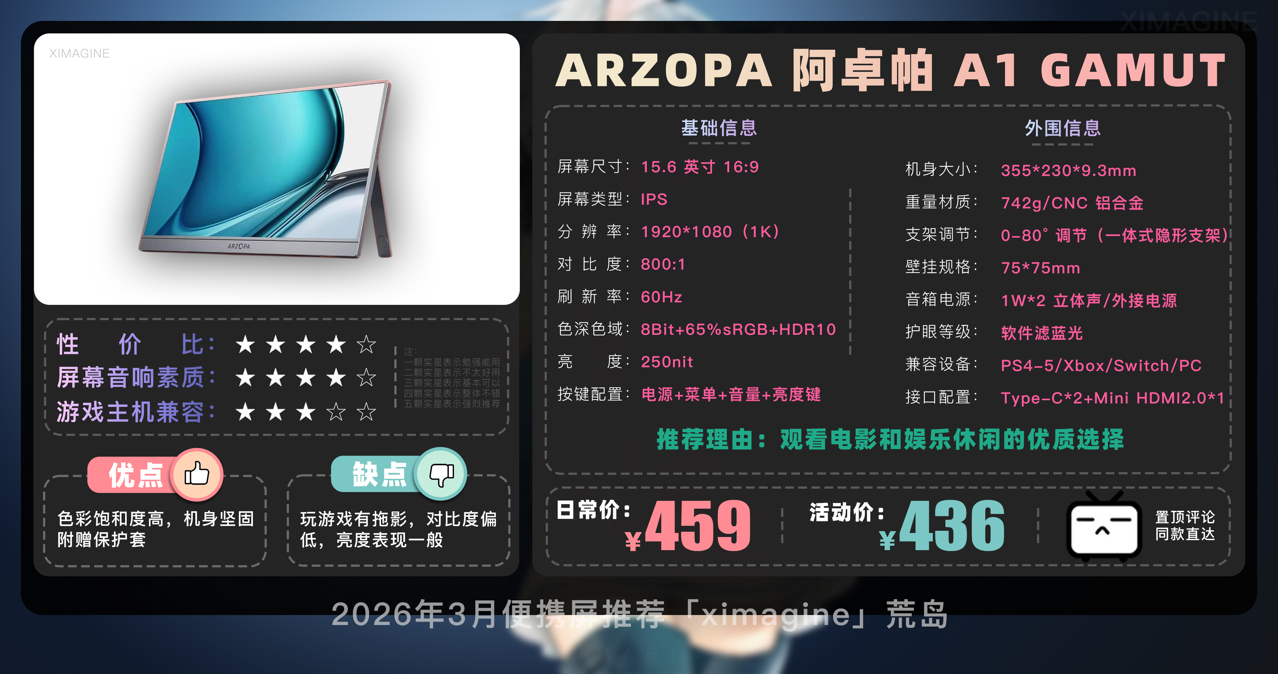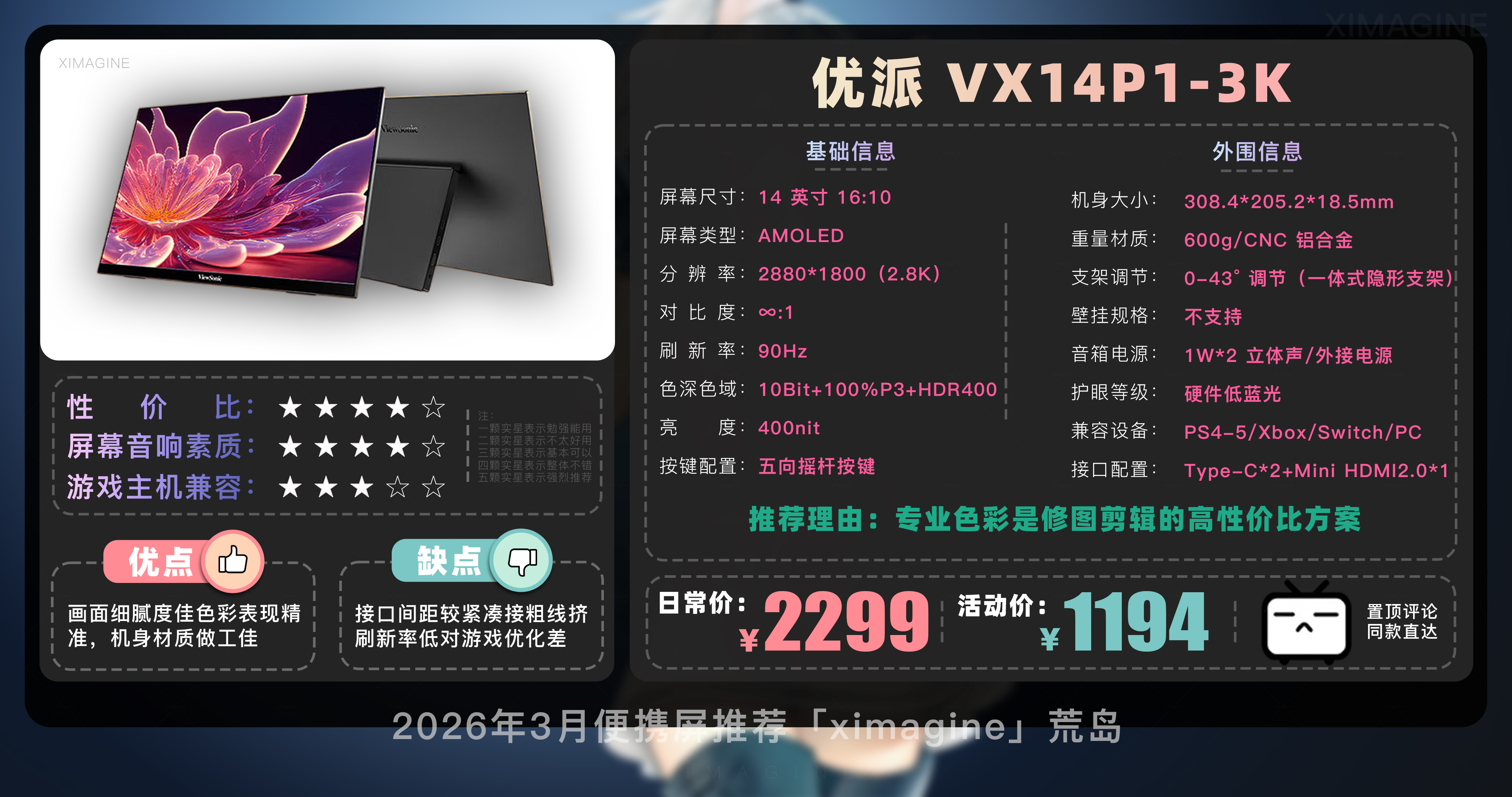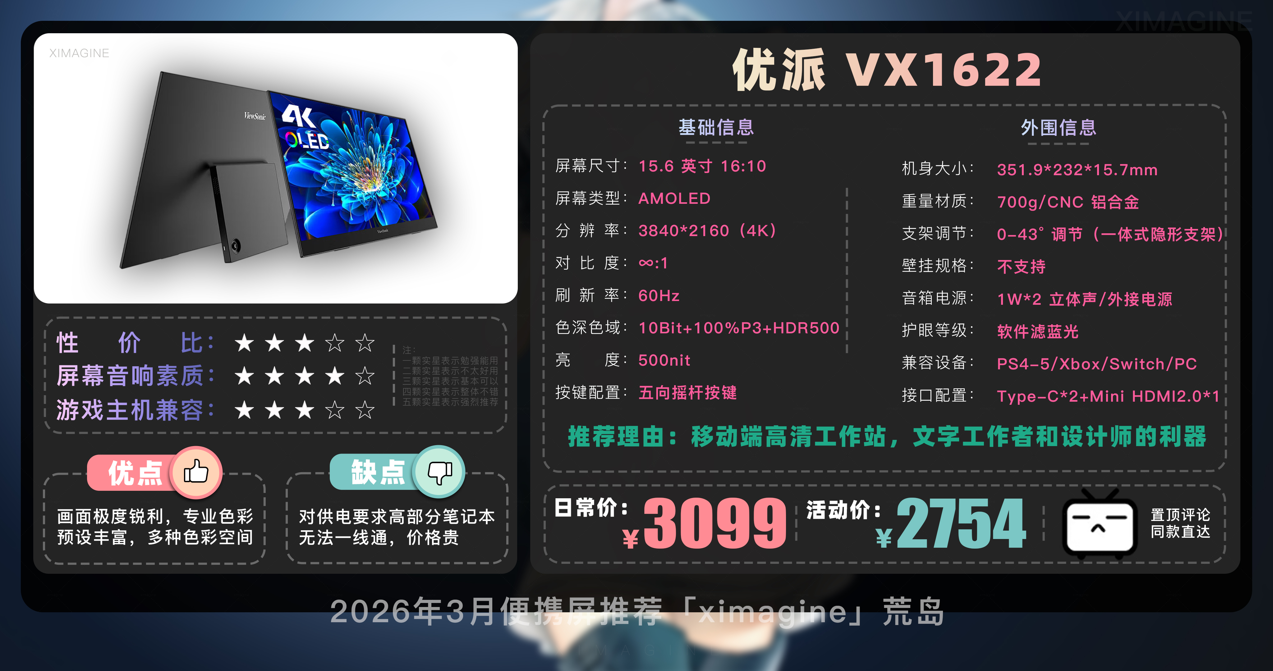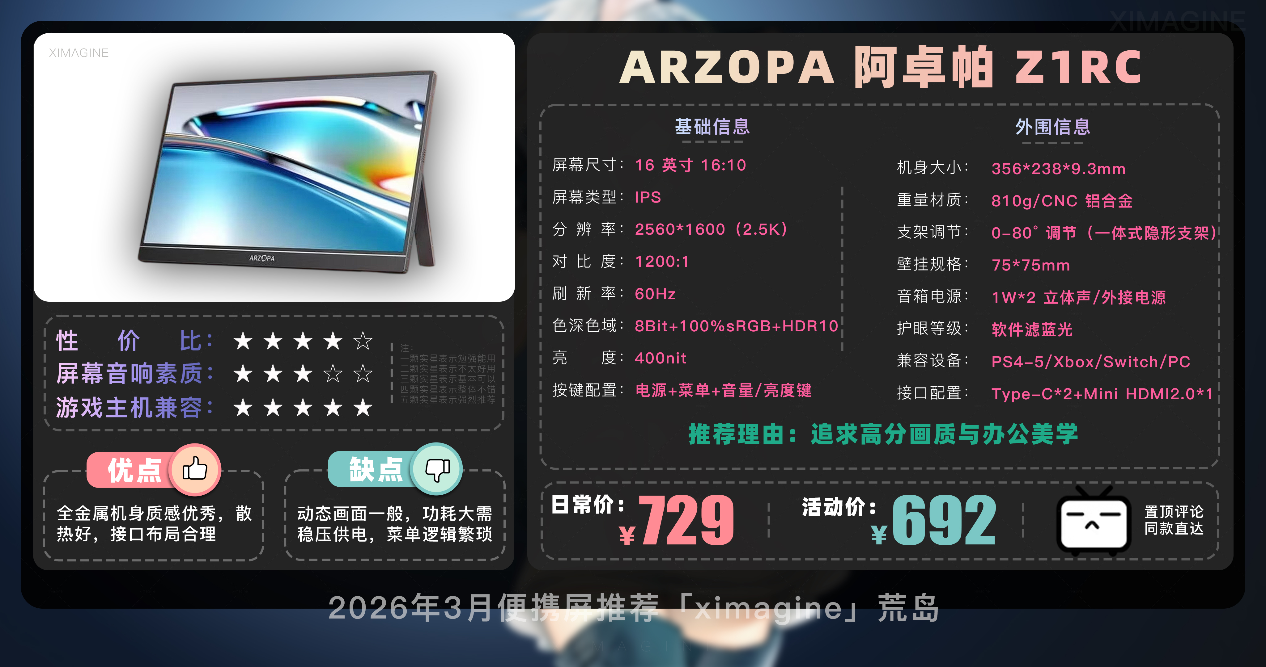 以上就是本期26年3月便携屏推荐清单,如果有心水的型号,可以戳置顶评论区对应链接拿下!如果只是想在通勤路上刷刷网页 14 英寸基础款就足够,如果是个对画质有执念的设计师,那么 OLED 高刷旗舰绝对值得多掏几百块钱,毕竟我们买的不仅是一块屏幕,更是一份随时随地开启高效状态的自由。如果觉得内容有所帮助,请关注荒岛,有你们的支持是我持续更新的动力!如果对选购便携屏还有疑问,欢迎在评论区留言我会尽快回复大家。本期就到这,我是「ximagine」下期再会!