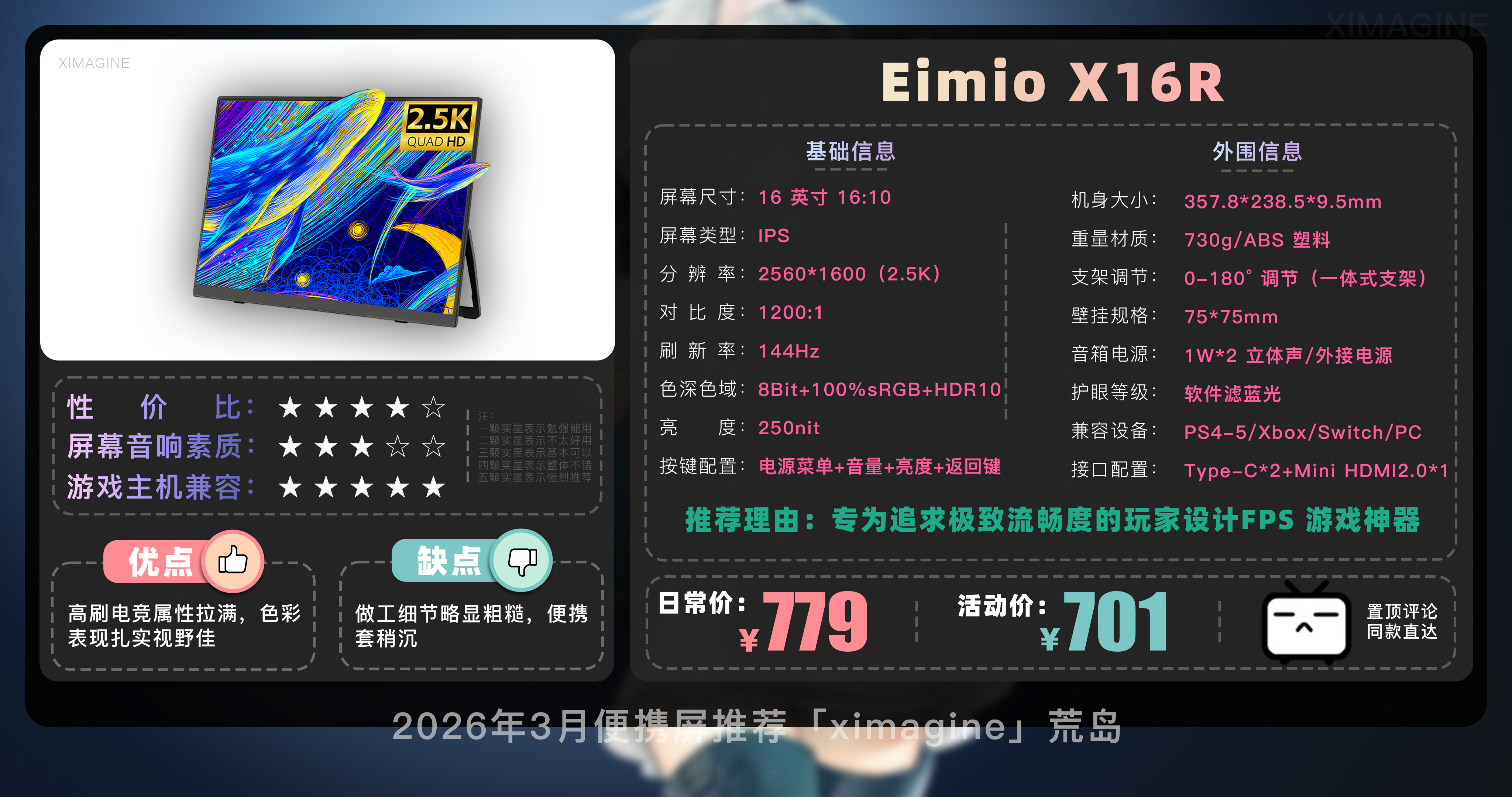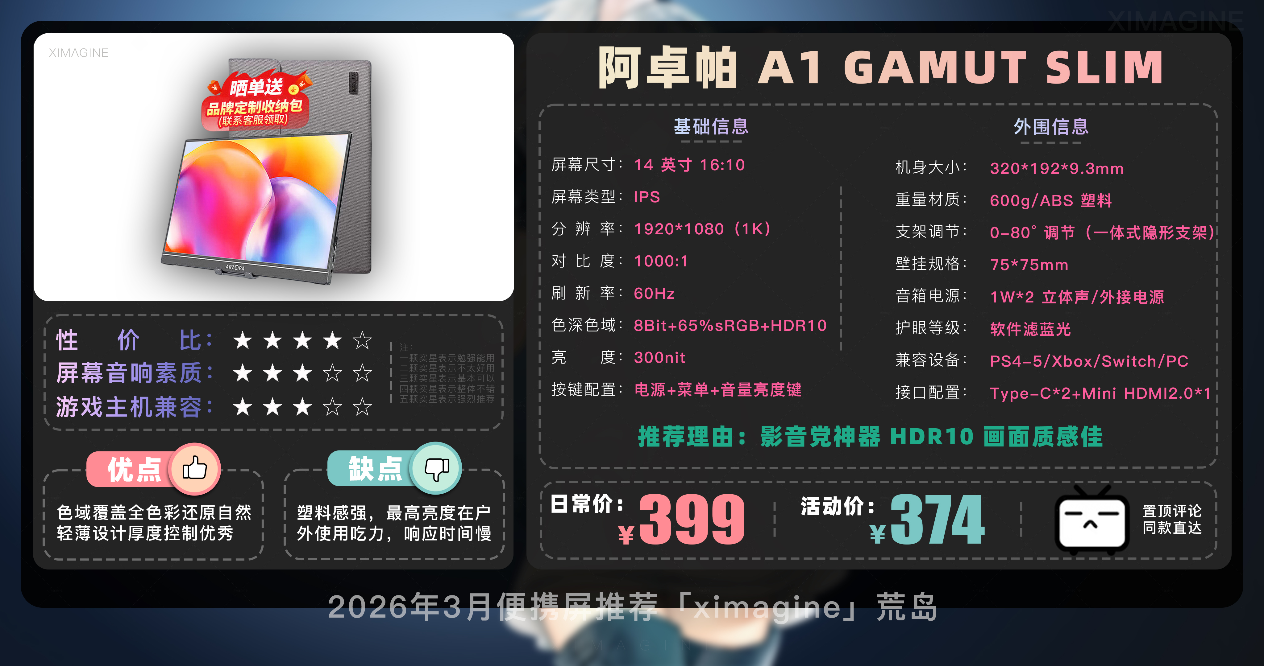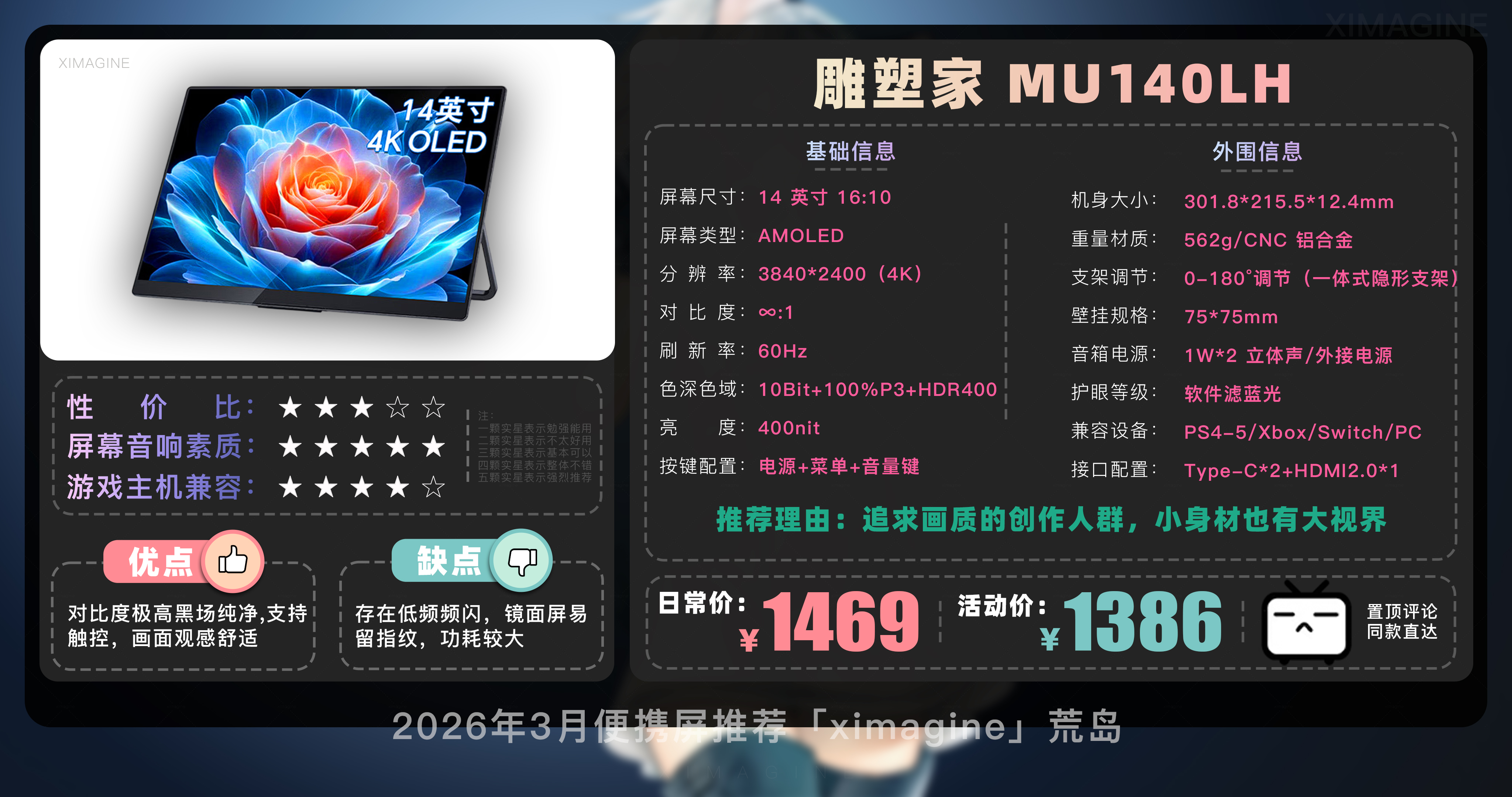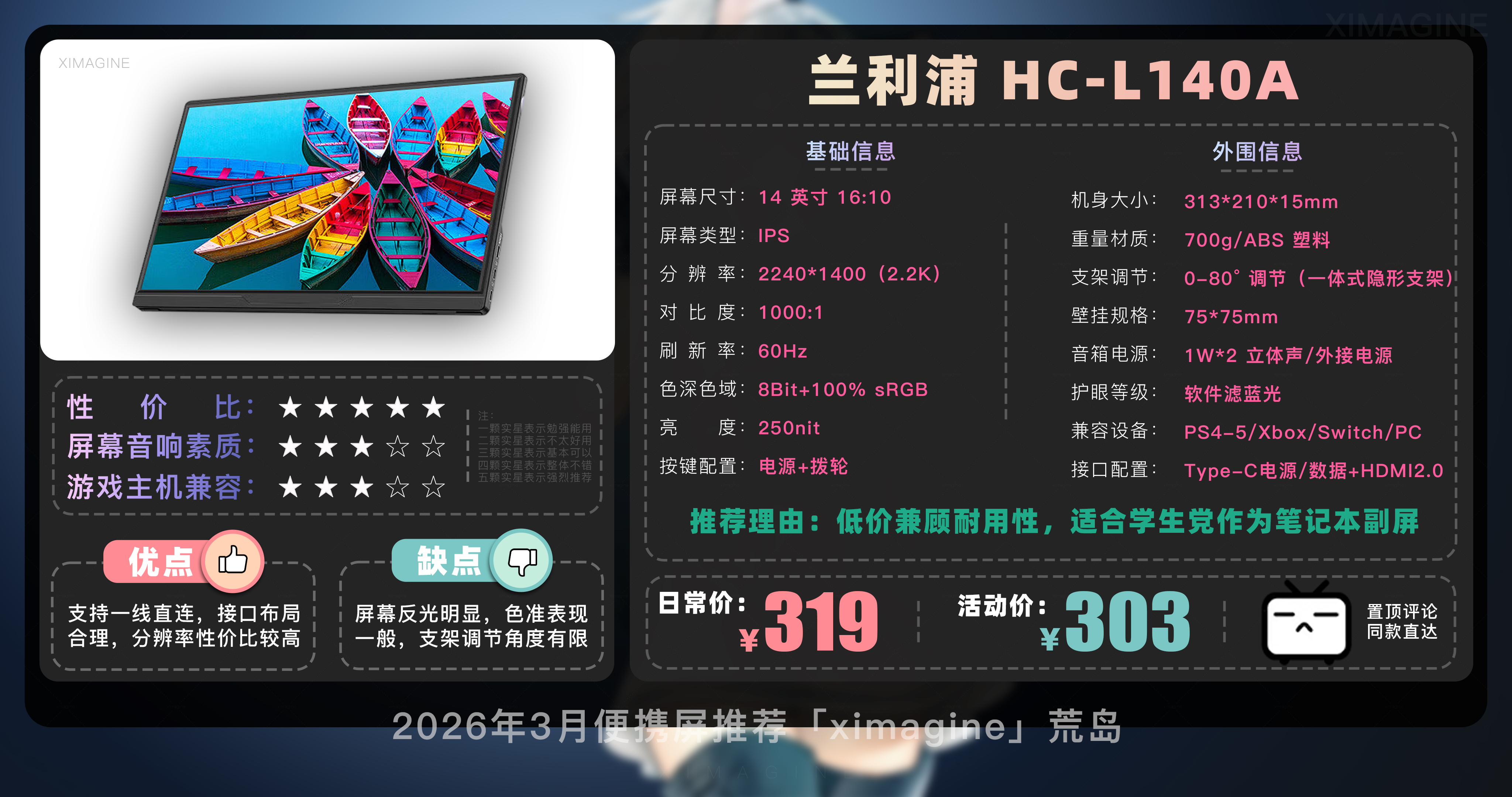 以上就是本期26年3月便携屏推荐清单,如果有心水的型号,可以戳置顶评论区对应链接拿下!如果只是想在通勤路上刷刷网页 14 英寸基础款就足够,如果是个对画质有执念的设计师,那么 OLED 高刷旗舰绝对值得多掏几百块钱,毕竟我们买的不仅是一块屏幕,更是一份随时随地开启高效状态的自由。如果觉得内容有所帮助,请关注荒岛,有你们的支持是我持续更新的动力!如果对选购便携屏还有疑问,欢迎在评论区留言我会尽快回复大家。本期就到这,我是「ximagine」下期再会!