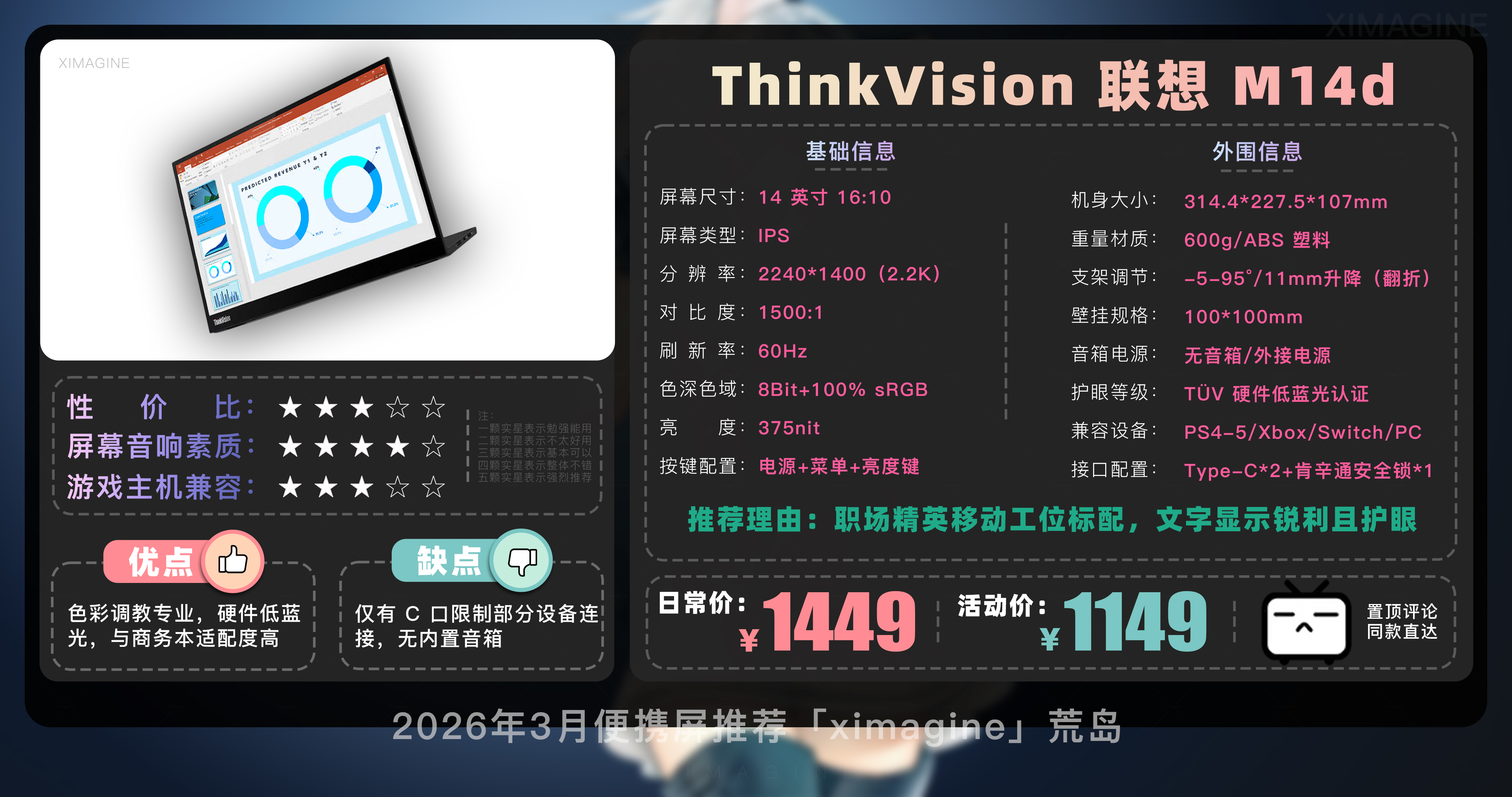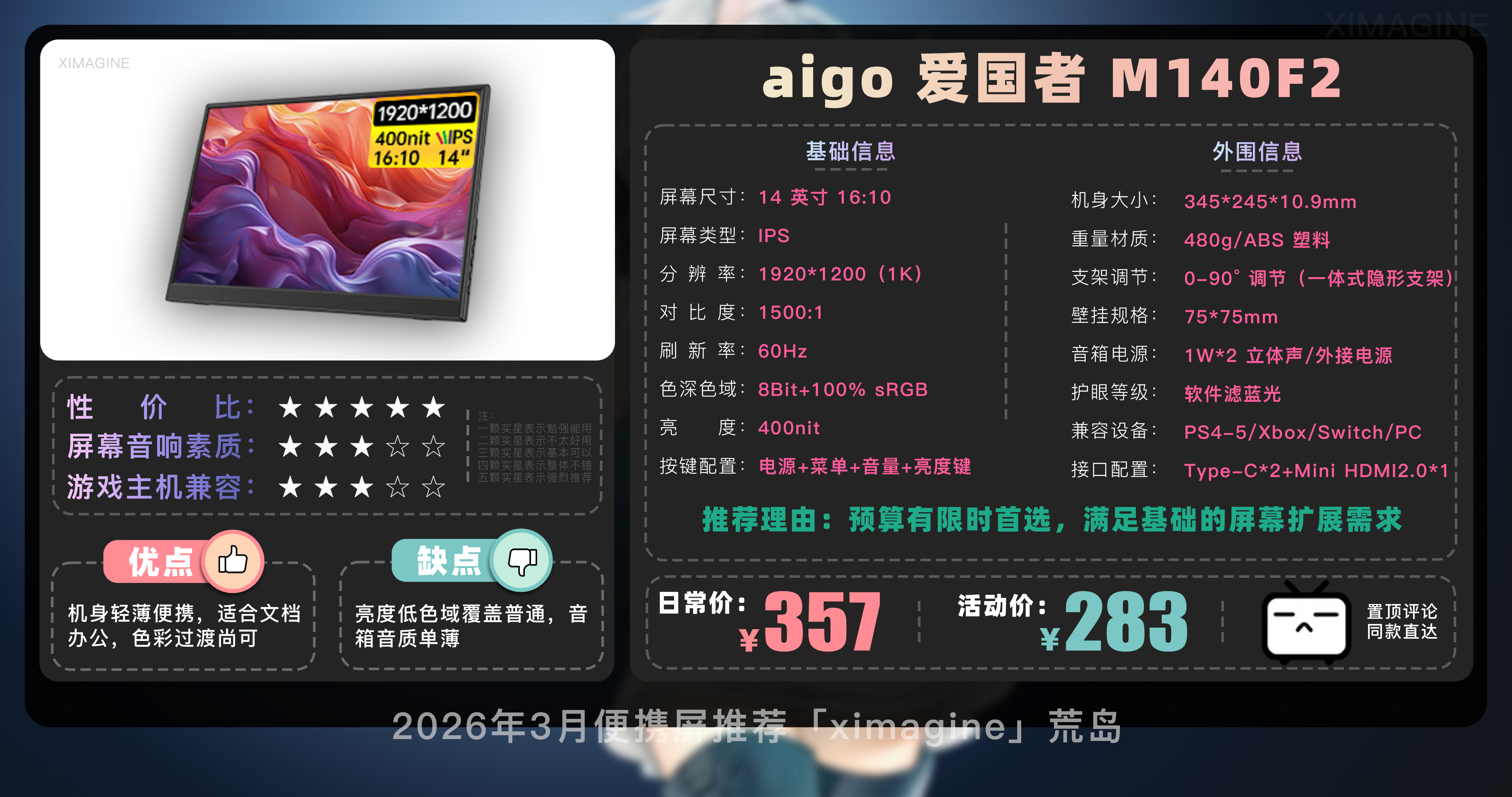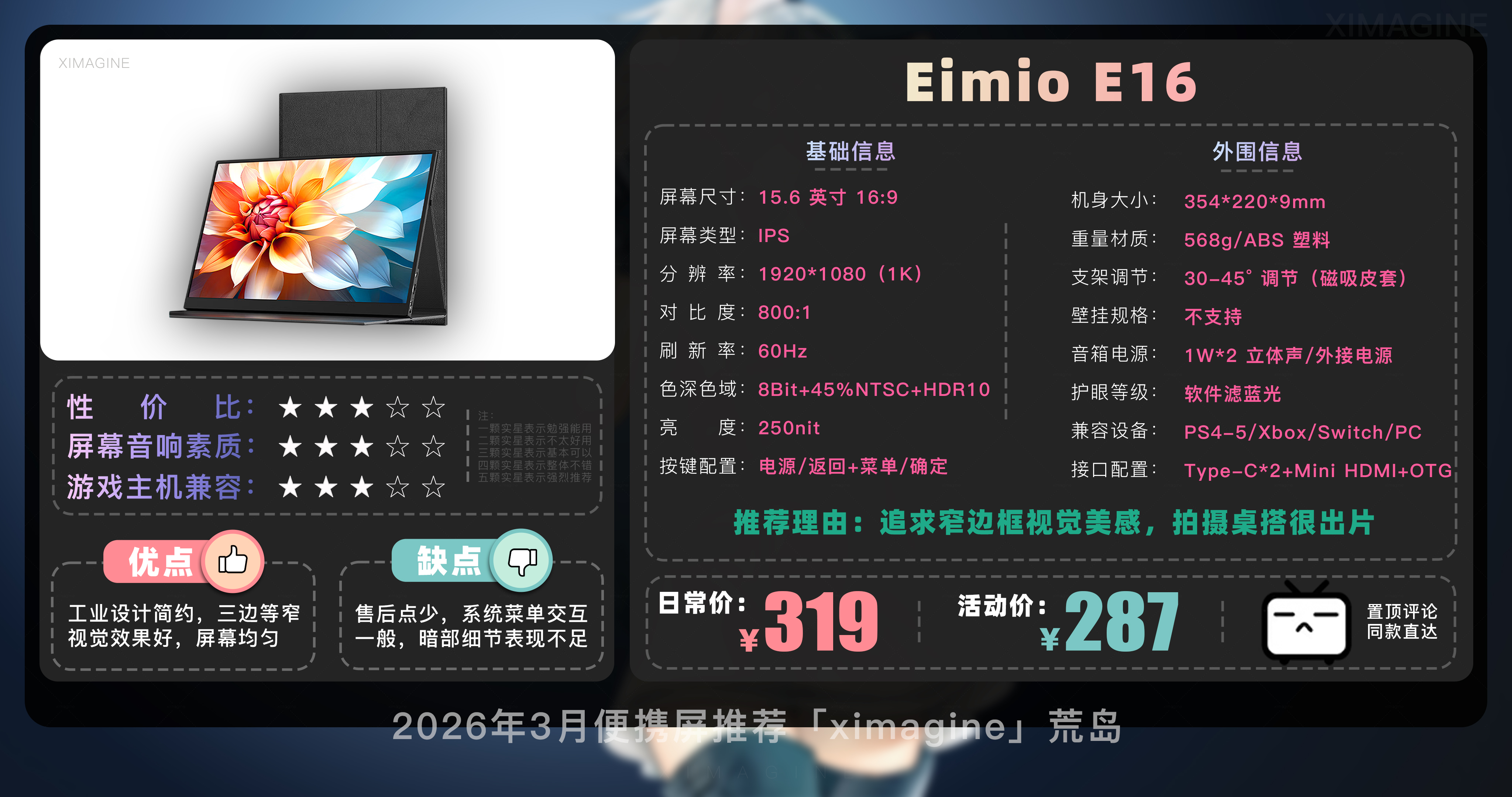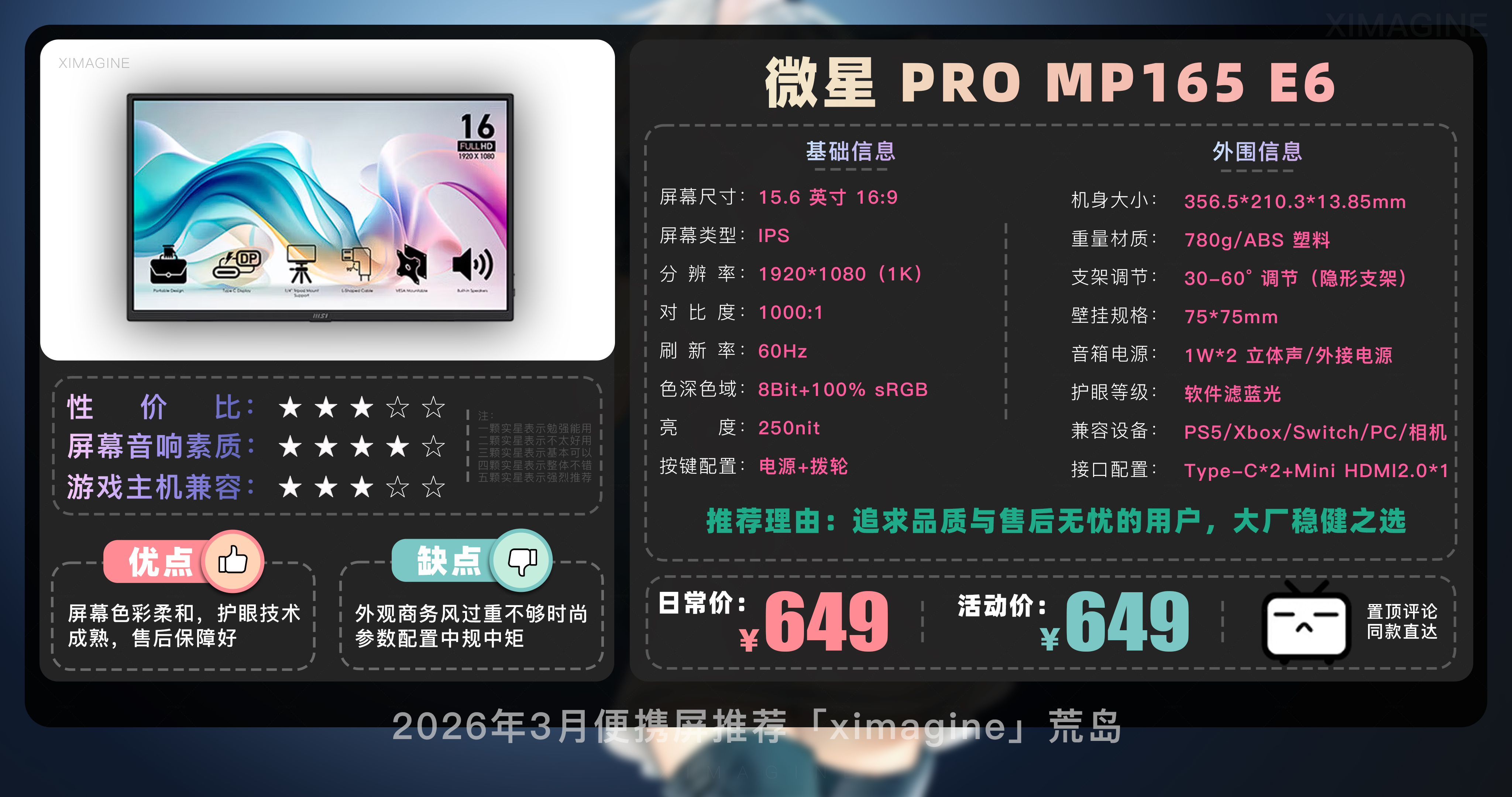 以上就是本期26年3月便携屏推荐清单,如果有心水的型号,可以戳置顶评论区对应链接拿下!如果只是想在通勤路上刷刷网页 14 英寸基础款就足够,如果是个对画质有执念的设计师,那么 OLED 高刷旗舰绝对值得多掏几百块钱,毕竟我们买的不仅是一块屏幕,更是一份随时随地开启高效状态的自由。如果觉得内容有所帮助,请关注荒岛,有你们的支持是我持续更新的动力!如果对选购便携屏还有疑问,欢迎在评论区留言我会尽快回复大家。本期就到这,我是「ximagine」下期再会!