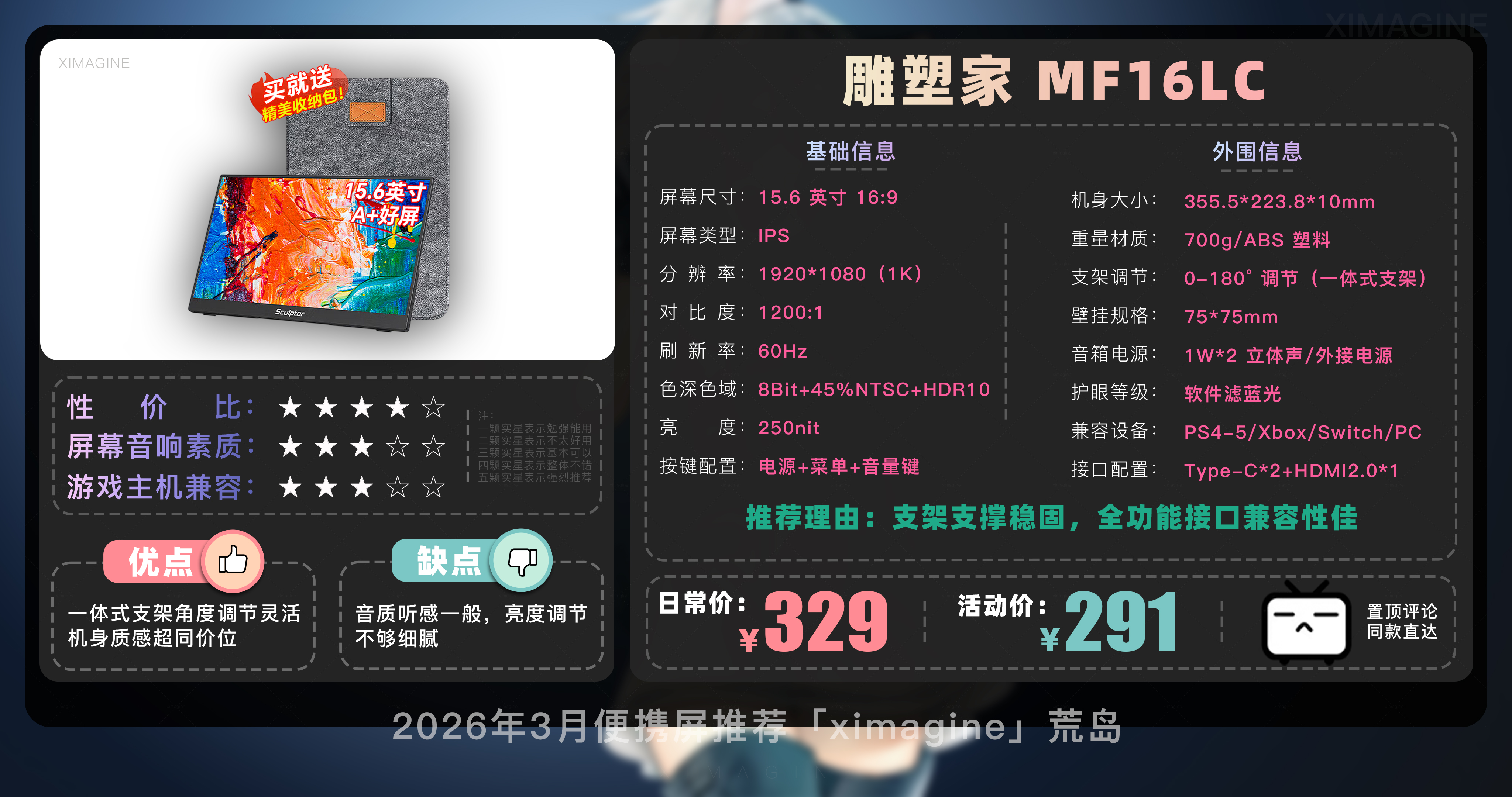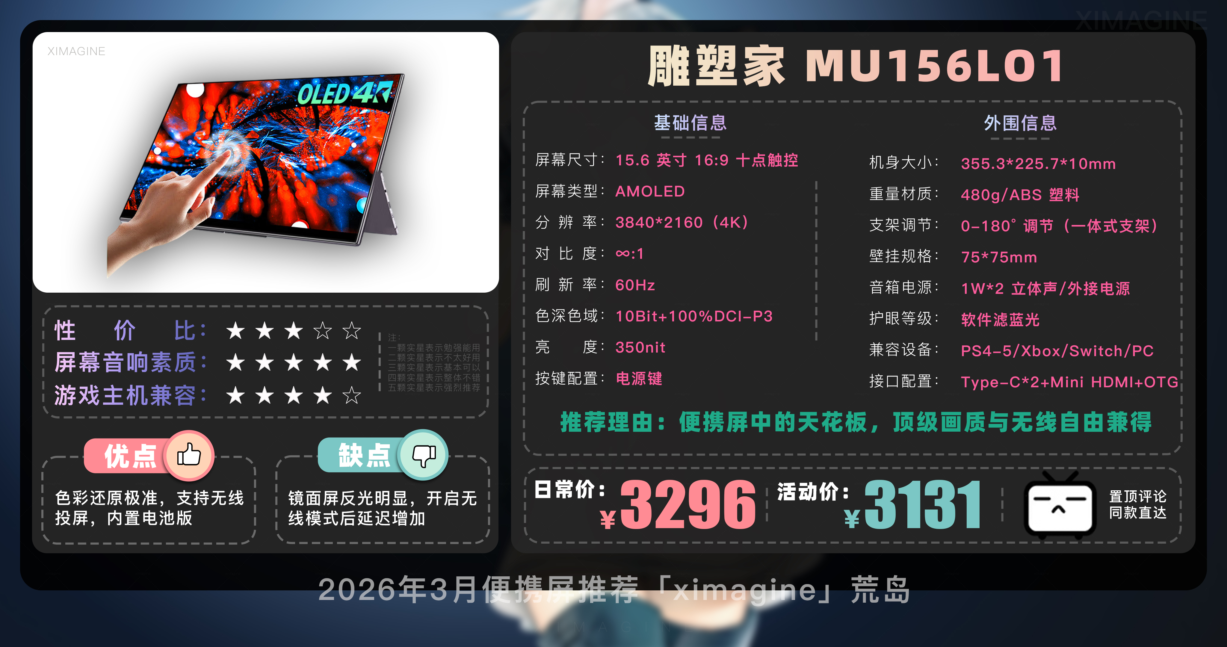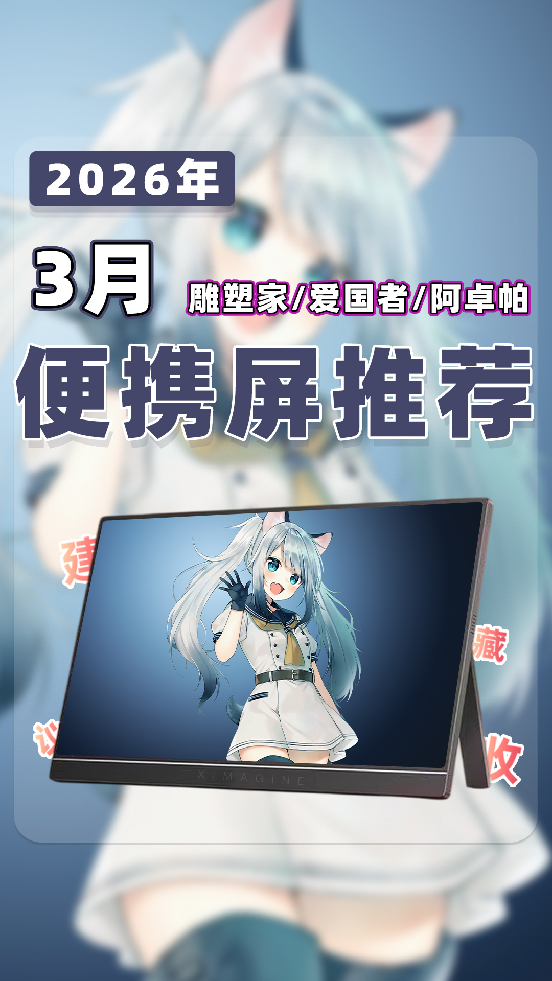 欢迎来到2026年3月便携屏推荐合集!我是本期的便携屏课代表「ximagine」便携屏到底有什么用?手机笔记本都自带屏幕,为啥还要再花几百块买便携屏?简单来说便携屏就是一块可以随时带走、全能外接的副屏显示器,它不是电脑但能让其他带屏设备变得好用,如果觉得笔记本电脑屏幕不够用,或是个爱折腾的游戏玩家,便携屏就是用过之后离不开的真香单品。那么面对市面上琳琅满目的型号,到底该怎么选呢?一看方便性:皮套结构便宜但容易倒,L型可0-90度调节更实用;13-14寸最便携,15.6寸是黄金尺寸;触屏大多支持 Windows 系统,macOS 系统需注意甄别;带 4096 级压感的可平替数位屏适合设计师,自带电池适合户外使用家用没必要。二看颜值:CNC 金属机身比 ABS 塑料机身更保护屏幕;窄边框带来沉浸感,但注意大下巴影响美观,机身厚度越薄价格越贵。三看画质:色域越高画面越鲜艳,普通办公 100% sRGB 够用,追求极致选 100% DCI-P3;分辨率2K或4K体验更佳,连接 Switch 用1080P够用;亮度 300nit 以上才能带出门。话不多说,正餐开始!