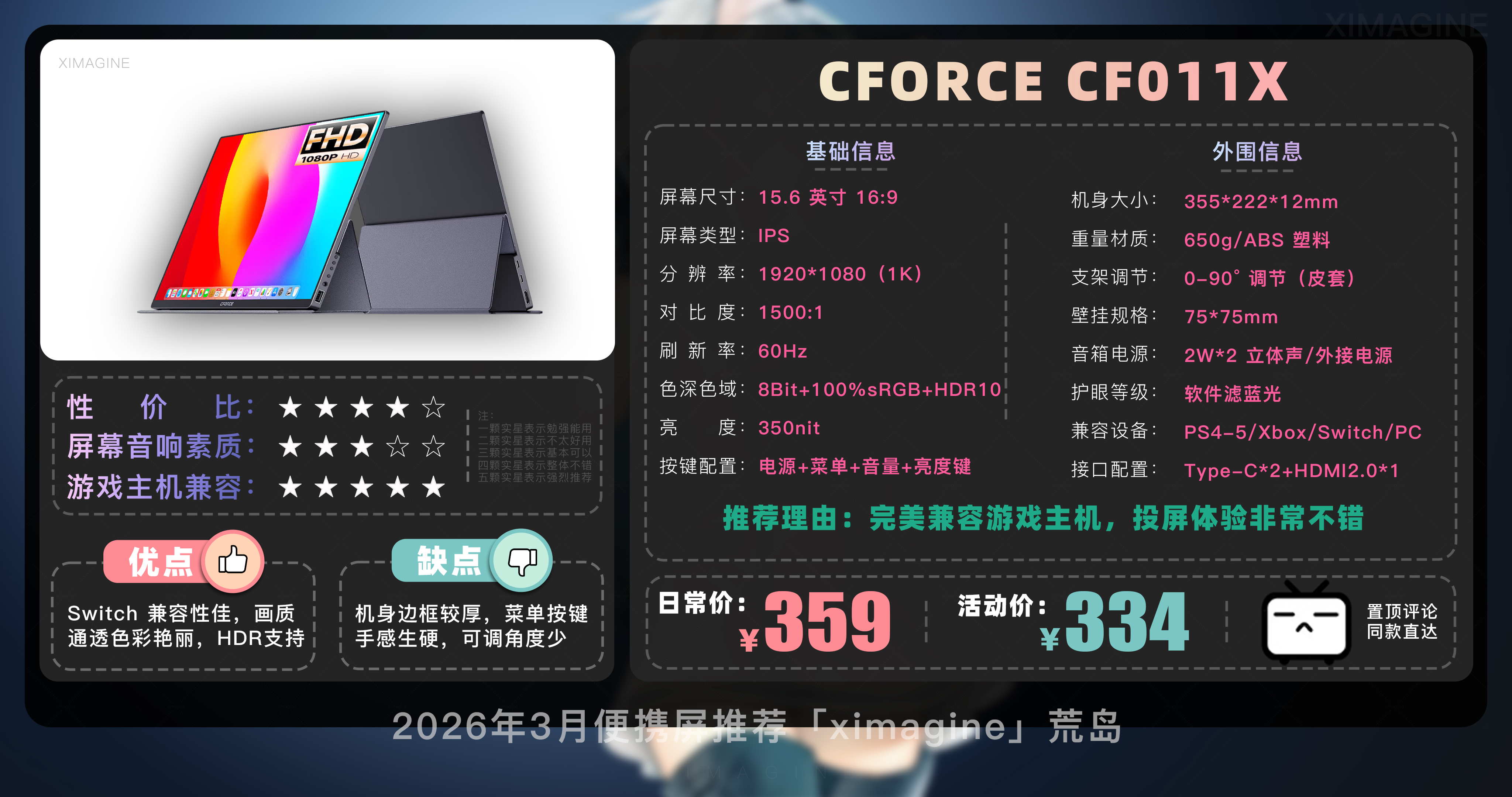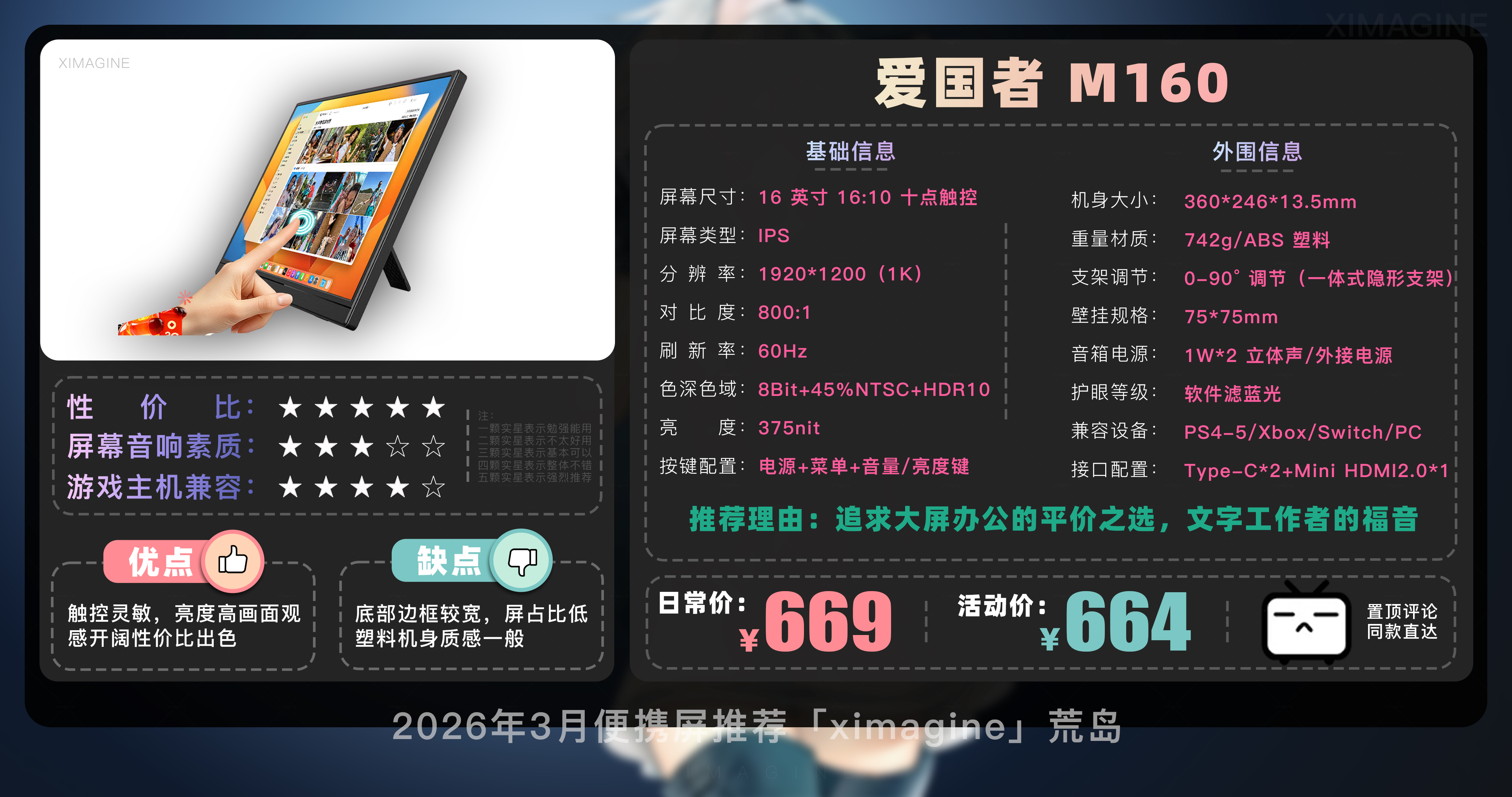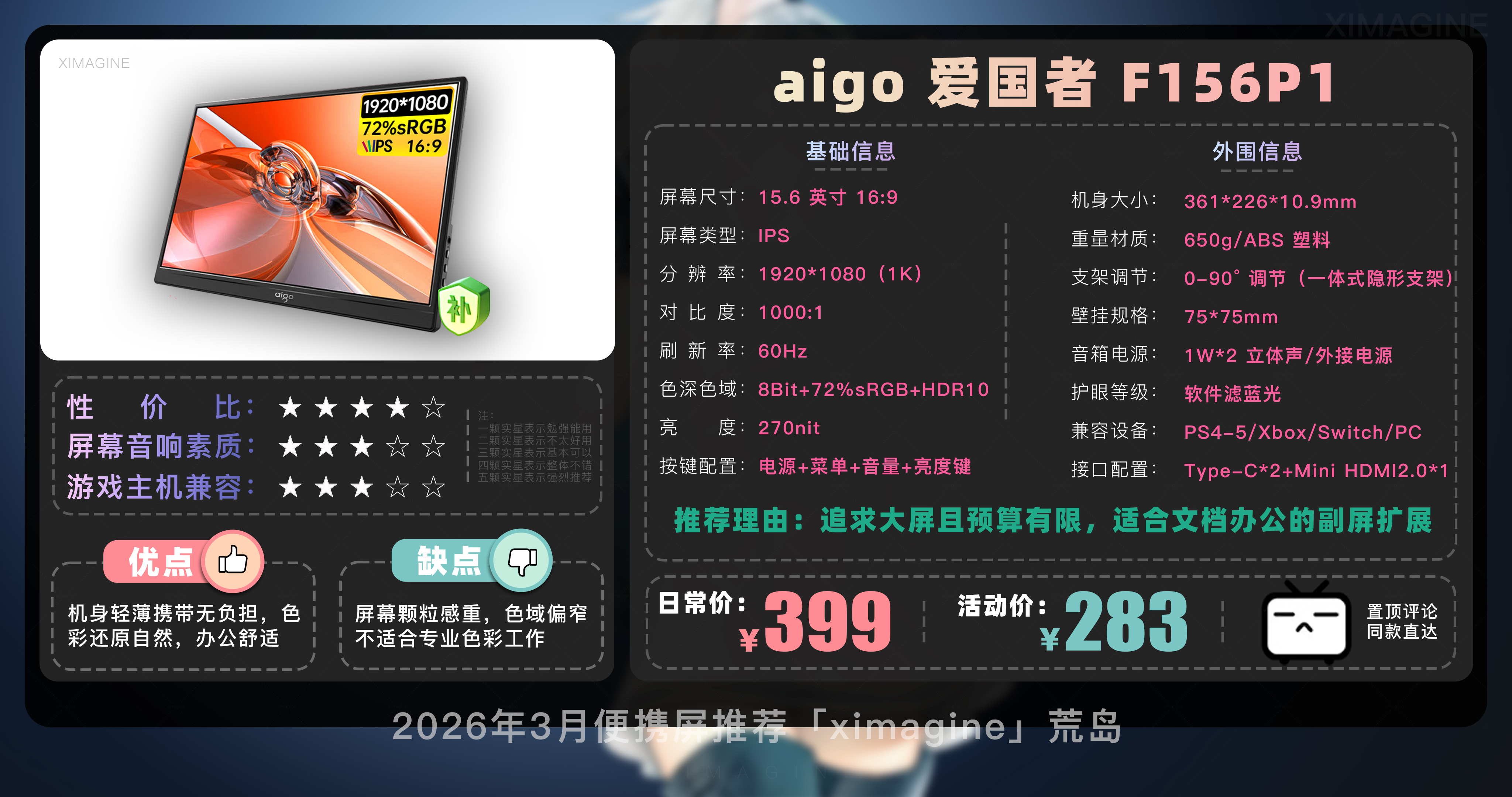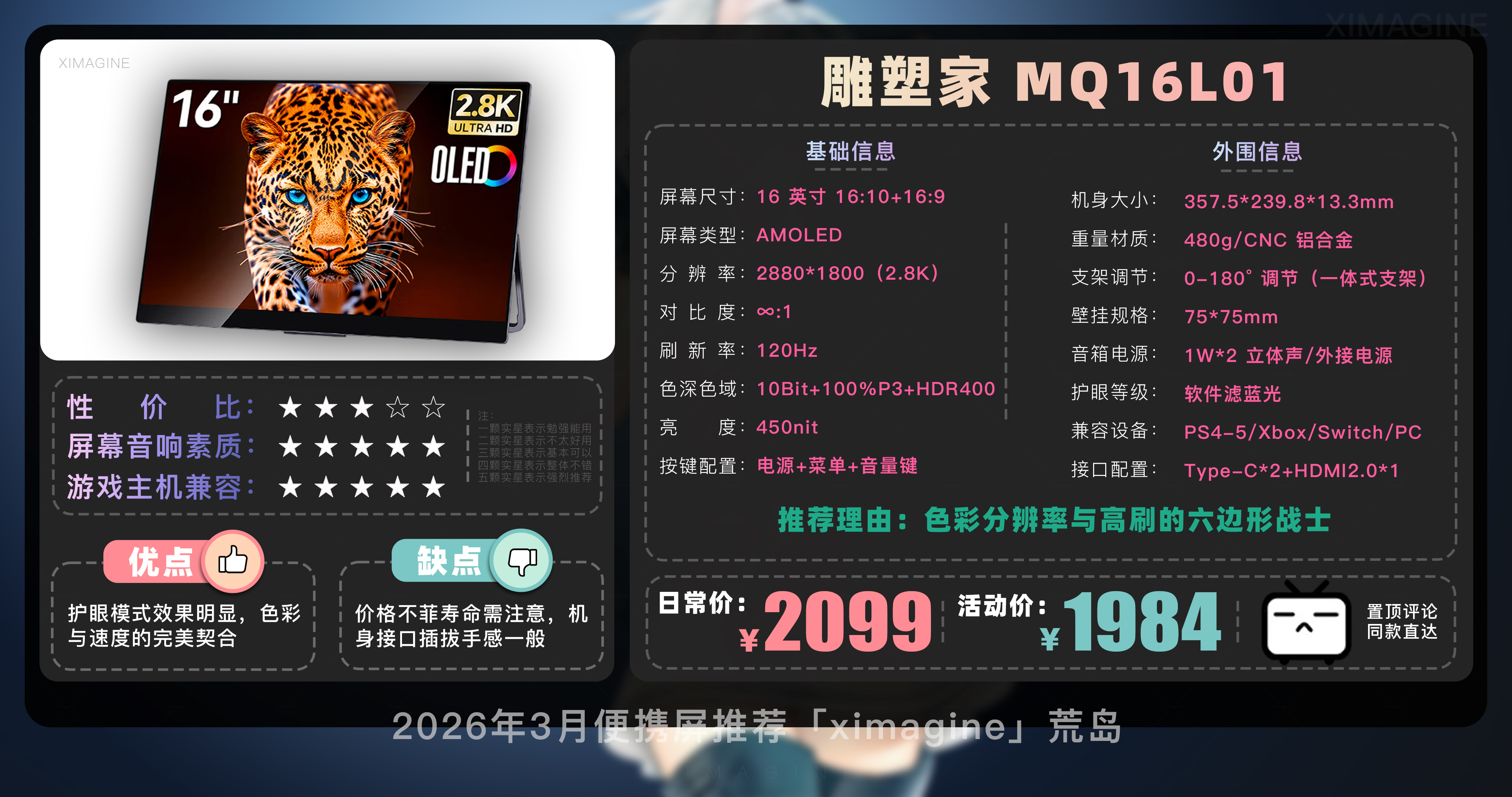 欢迎来到2026年3月便携屏推荐合集!我是本期的便携屏课代表「ximagine」便携屏到底有什么用?手机笔记本都自带屏幕,为啥还要再花几百块买便携屏?简单来说便携屏就是一块可以随时带走、全能外接的副屏显示器,它不是电脑但能让其他带屏设备变得好用,如果觉得笔记本电脑屏幕不够用,或是个爱折腾的游戏玩家,便携屏就是用过之后离不开的真香单品。那么面对市面上琳琅满目的型号,到底该怎么选呢?一看方便性:皮套结构便宜但容易倒,L型可0-90度调节更实用;13-14寸最便携,15.6寸是黄金尺寸;触屏大多支持 Windows 系统,macOS 系统需注意甄别;带 4096 级压感的可平替数位屏适合设计师,自带电池适合户外使用家用没必要。二看颜值:CNC 金属机身比 ABS 塑料机身更保护屏幕;窄边框带来沉浸感,但注意大下巴影响美观,机身厚度越薄价格越贵。三看画质:色域越高画面越鲜艳,普通办公 100% sRGB 够用,追求极致选 100% DCI-P3;分辨率2K或4K体验更佳,连接 Switch 用1080P够用;亮度 300nit 以上才能带出门。话不多说,正餐开始!