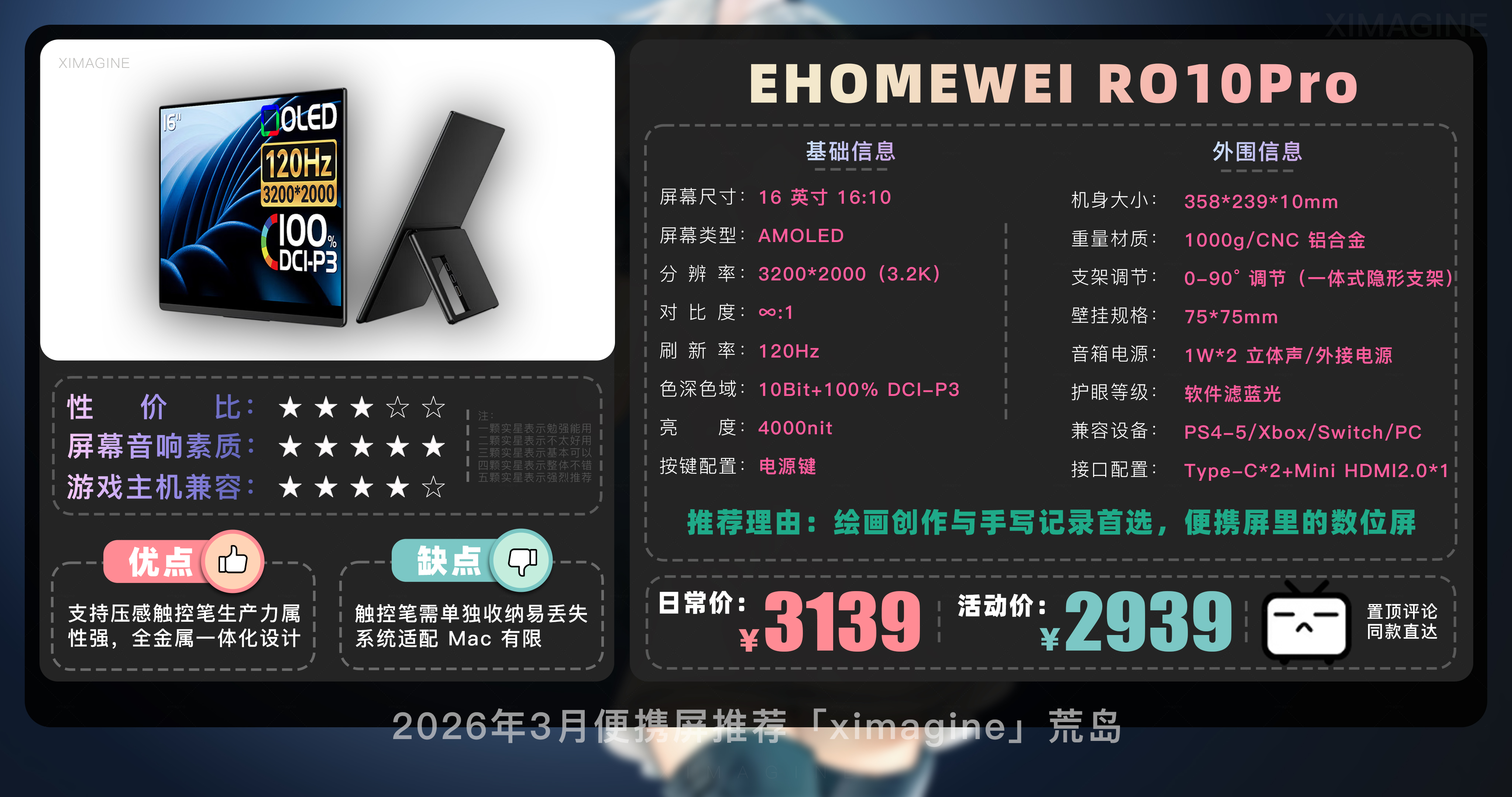 EHOMEWEI RO10Pro 对 4096 级压感触控笔的支持,变身成一块专业的手绘屏,在修图或手写速记时表现得细腻自然,3.2K 分辨率与 120Hz 刷新率已经是顶配,全金属 CNC 一体化机身带来的精致感,在咖啡厅拿出来很吸睛。支架设计非常优雅,可以以极低的角度倾斜,完美契合书写姿势,2939 元的它软件生态更倾向于 Windows 用户,但其精湛的工艺和全能的表现,成为追求极致生产力与艺术创作用户的梦幻单品。