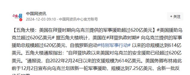 根据五角大楼的通报,白宫向乌克兰提供的各项援助总价值已经高达620亿美元。