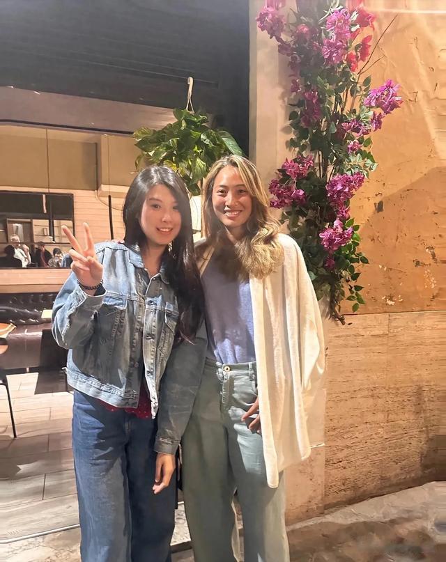 二人合照中,郑钦文上身一件浅蓝色内搭,外面一件白色宽松外套,下身配一条浅色直筒牛仔裤,一头大波浪金色长发垂肩,腼腆而温暖的笑容洋溢在脸上,非常有气质,随和中又有几分霸气,女王范儿十足。