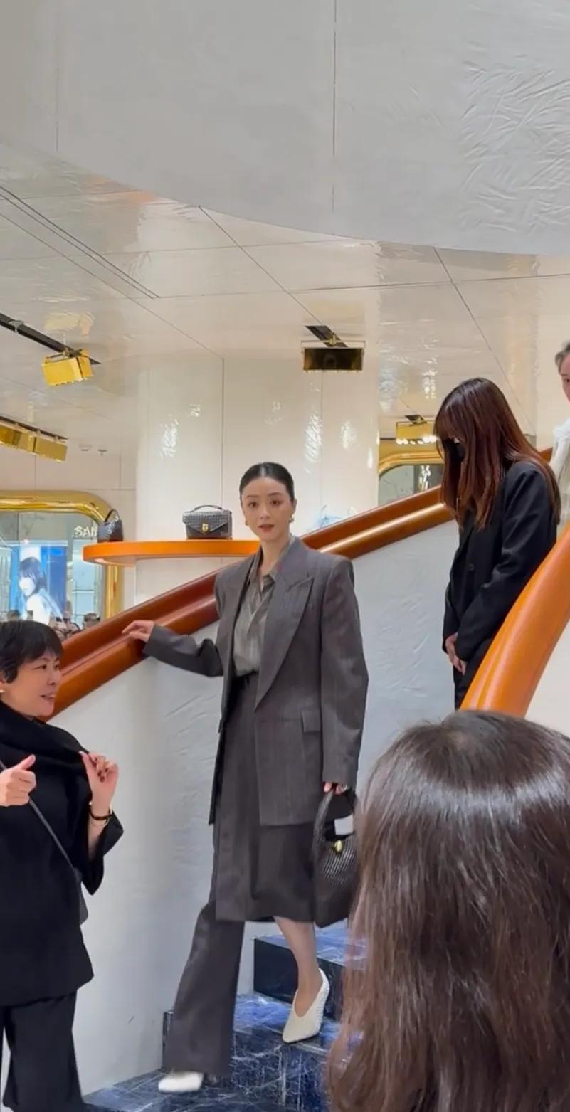 蒋欣穿着灰色西装搭配灰色宽肩西装,蒋欣扎着高马尾辫,她戴着金色素圈耳饰,蒋欣气场全开,她帅气又美丽。蒋欣的脸很小,镜头里的她越来越美。蒋欣的皮肤很白皙透亮,41岁的蒋欣状态好极了。