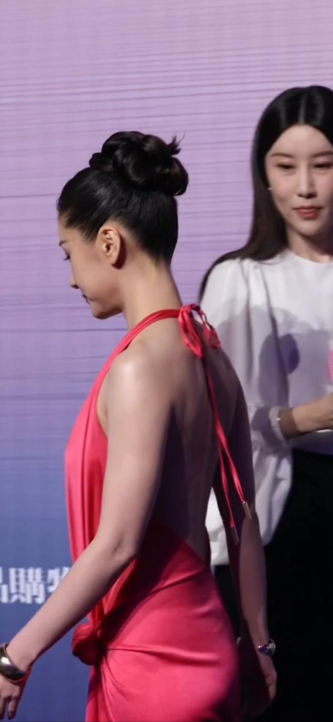王子文当晚穿了一条玫粉色挂脖礼服出席风尚之夜,她在舞台上整个人都在发光。王子文虽然个子不高,但是她比例很好,她很挺拔纤细。