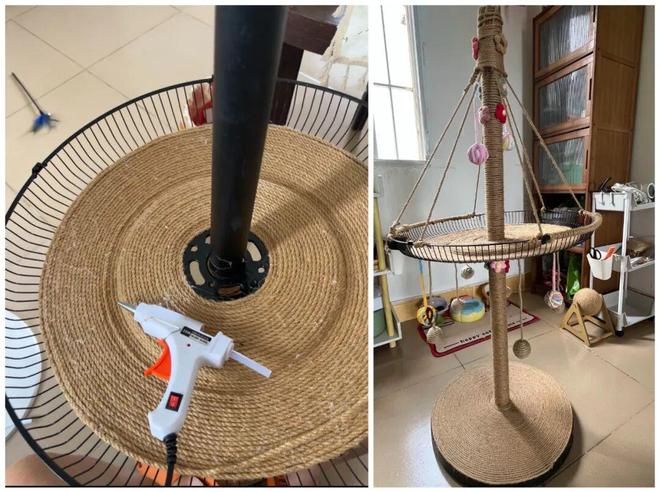 网友@土豆卷子:家里有猫,千万不要把旧风扇扔了,只需要3步,就可以改造成一个猫爬架,具体如下。
