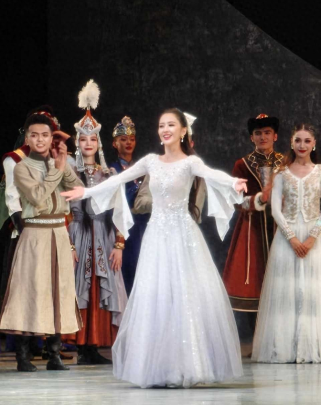舞台上的佟丽娅一袭白纱裙,就像从民族画卷中走出来的精灵,每一个动作都带着新疆的韵味,灵动,柔美又有力量感。