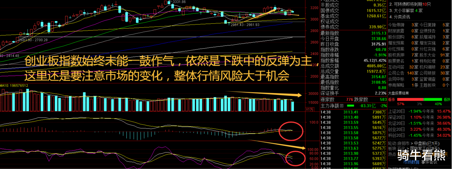 创业板指数周四出现明显的弱势走势,这也是跷跷板行情所导致的,大盘类个股上涨,中小盘股下跌,毕竟就这么多资金。中期来看本轮市场行情或仍未结束,在中长期资金压舱石作用、居民资金入市仍有空间、科技创新政策加码与AI产业趋势向上的多重因素作用下,本轮A股市场行情向上空间犹存。接下来注意创业板指数能否在3100点之上稳住。