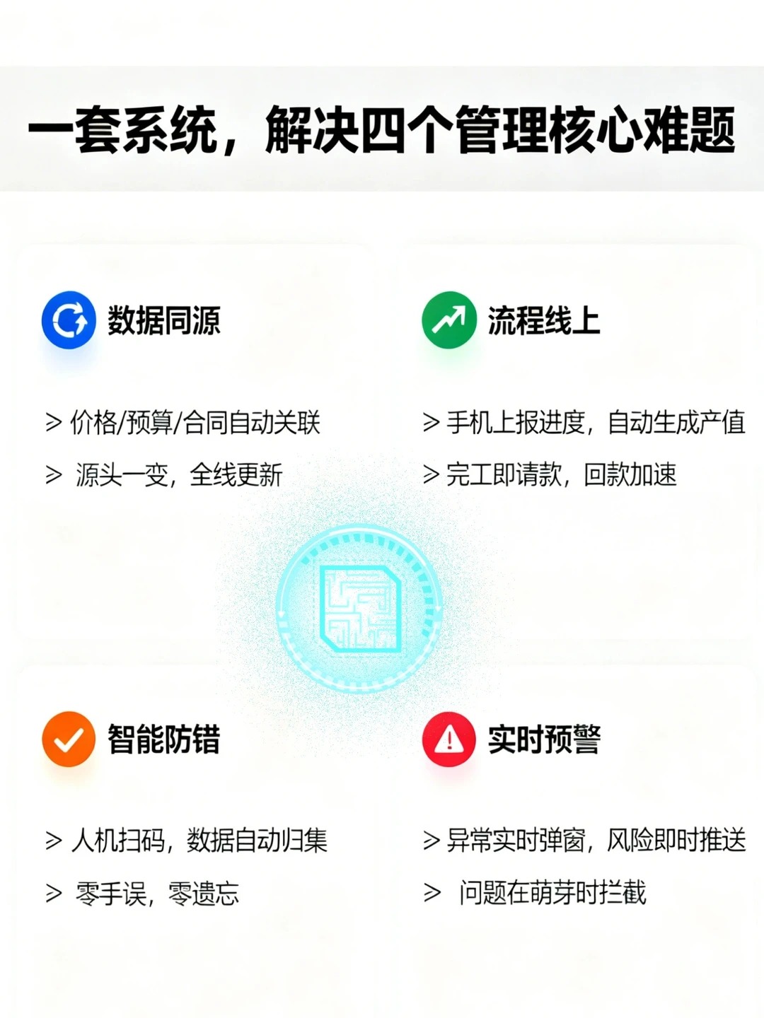 我们一位做市政工程的客户,去年项目结算时发现利润少了10多万。复盘时所有人都懵了——问题出在哪? - 🔍 事后总结,全是“信息差”惹的祸: 1️⃣ 材料涨价了,但采购单上还是老价格 2️⃣ 活干完一周,进度款还没申请 3️⃣ 机械台班结算时多出150个小时 10万利润,就在Excel、微信和口头传达中悄悄流失。 - 💡 用了我们系统后,彻底改变: ✅ 数据实时同步:价格一调,所有关联文件自动更新 ✅ 流程线上化:手机上报进度,系统自动发起请款 ✅ 智能防错:机械扫码打卡,台班自动记录 ✅ 风险预警:成本一超支,立刻弹窗提醒 📊 改变看得见: 对账时间:3天→1小时 数据准确率:70%→99% 利润能见度:事后才知道→天天看得见 - 如果你也在经历: ▷ 表格越做越多,数据越来越乱 ▷ 重要信息总在微信里“淹没” ▷ 月底总在为数据“扯皮” - 他的弯路,你不必再走。