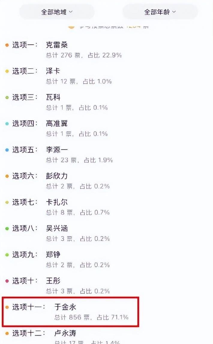 在比赛结束后,望岳新闻给泰山队的第一轮比赛选了个最佳球员,结果替补上场的于金永毫无悬念地成了大家心中的最佳。他拿到了超过70%的选票,有856个球迷支持他,比第二名的克雷桑多得多。这真是对他表现最好的认可,可以说是当之无愧了。这也说明球迷们都很认可于金永的表现。