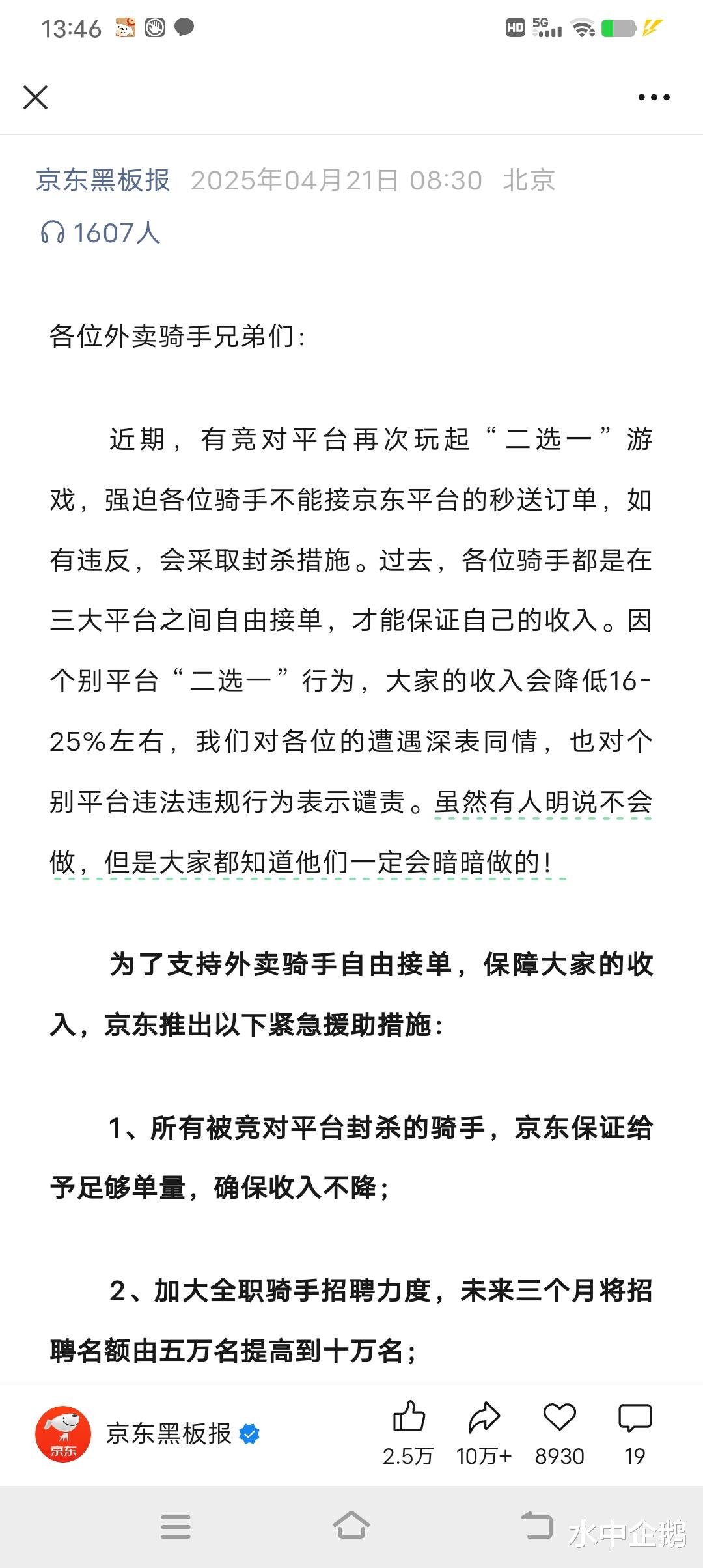 2025年,春末夏初的互联网江湖,一场关于外卖骑手权益的 "明争暗斗" 引发行业震荡。京东高调发布《致全体外卖骑手兄弟们的公开信》,剑指某些平台强迫骑手 "二选一" 的行业潜规则。在这场看似寻常的商业博弈背后,折射出中国互联网经济正在经历的深刻转型与复苏信号。