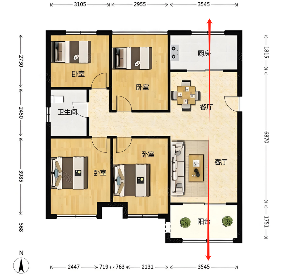 我们的活动区域,例如客厅、餐厅、厨房要在一条纵向线上,我们的休息区域,也就是卧室,也要在一条纵向线上,两条纵线要分离开来,这样能保证家人在休息的时候,我们在活动区内活动能不影响他们。
