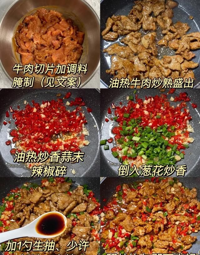2、牛肉切片加调料腌制,油热牛肉炒熟盛出
