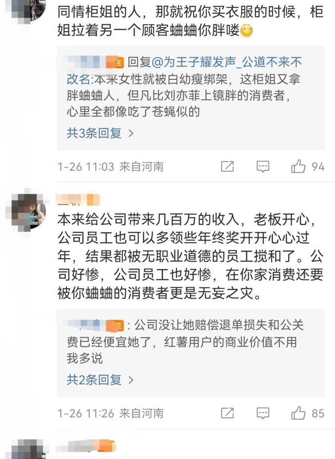 一些网友评论说:“每一个女孩都享有不被注视的穿衣自由权利,没有一个顾客会愿意消费,结果一出店门就会被蛐蛐弄脏,如果消费者消费了还会受到审判,这似乎没有这样的道理吧。”还有一些网友表示:“问题的核心不在于【发表刘亦菲微胖】,而是【用官方账号发表这样的言论,蛐蛐顾客】。如果她是个人账号,无论如何都不会被开除,但如果她使用官方账号,那就是错误的,可能会被退货数百万。这对于高端服务行业来说,是一个大忌。”