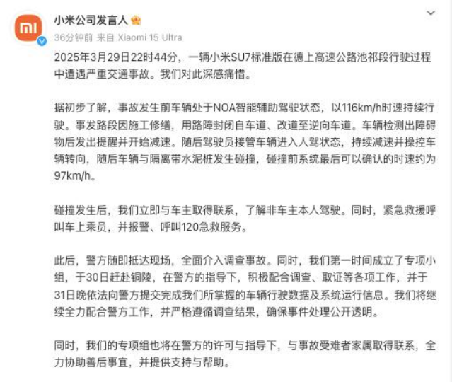 这场事故迅速引发社会关注,但小米官方的首次回应出现在4月1日午间,间隔超过72小时。这种“解释滞后”直接导致舆论真空期被质疑、猜测和情绪化叙事填满,最终演变为对小米智驾技术、企业责任乃至价值观的全面拷问。