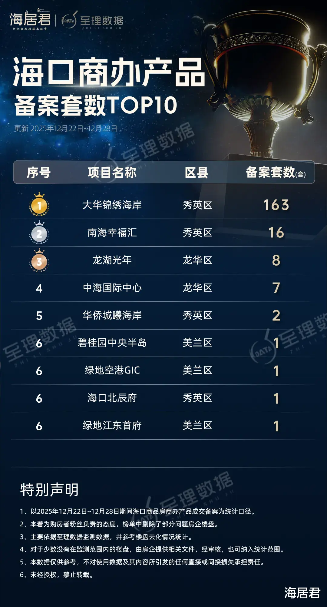“至理数据”海南房地产大数据平台显示,上周海口商品房『商办』产品成交备案200套,其中大华锦绣海岸成交备案163套商办,遥遥领跑。