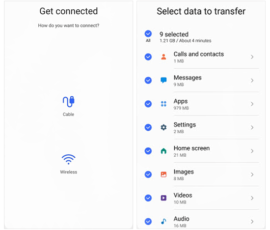 如果您想将所有内容传输到新的 Android 手机,请选择支持各种文件类型的工具,例如 Phone to Phone Transfer 和 Smart Switch。