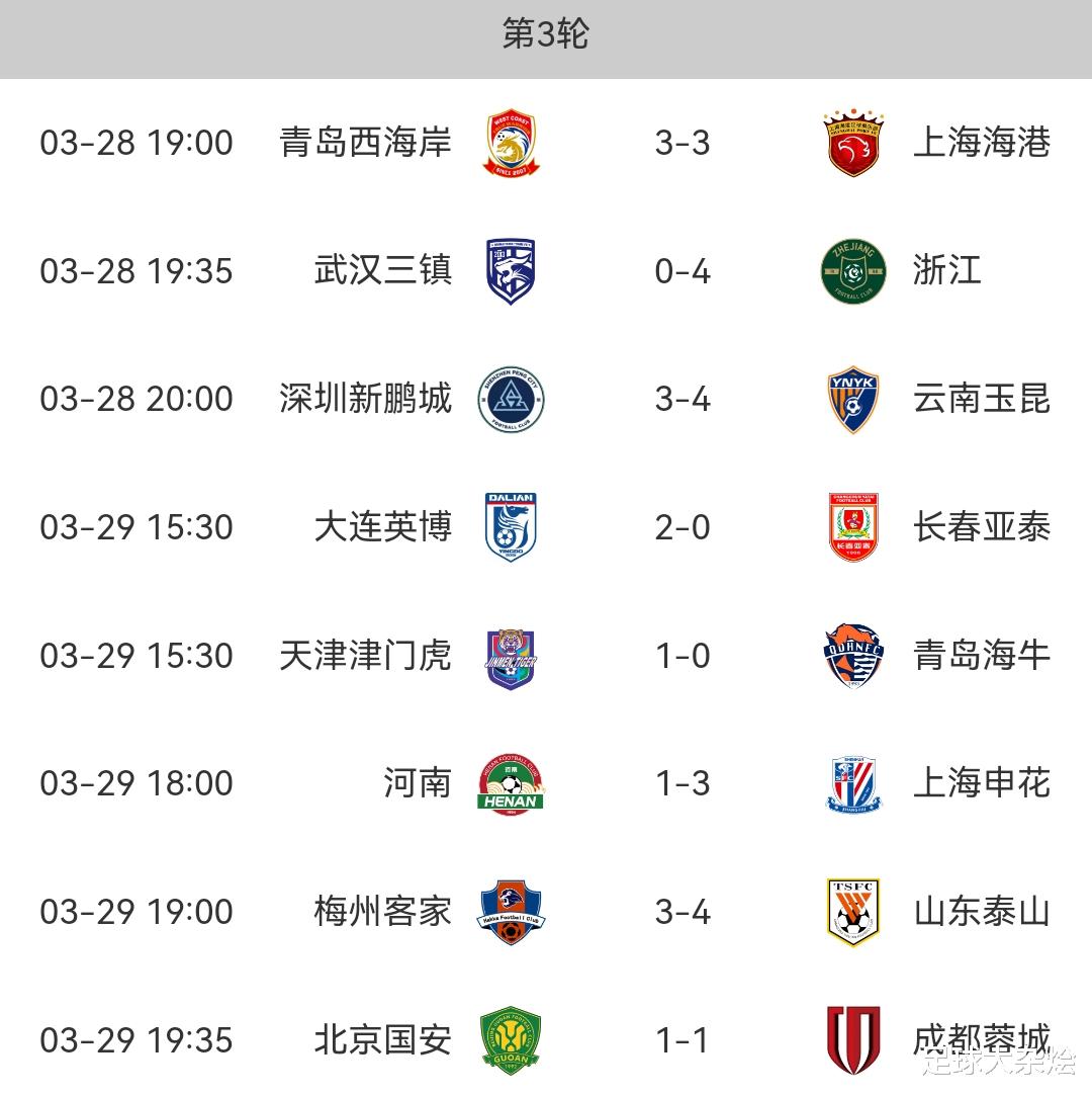 截止3月29日晚,中超第三轮全部结束,具体赛果如下:
