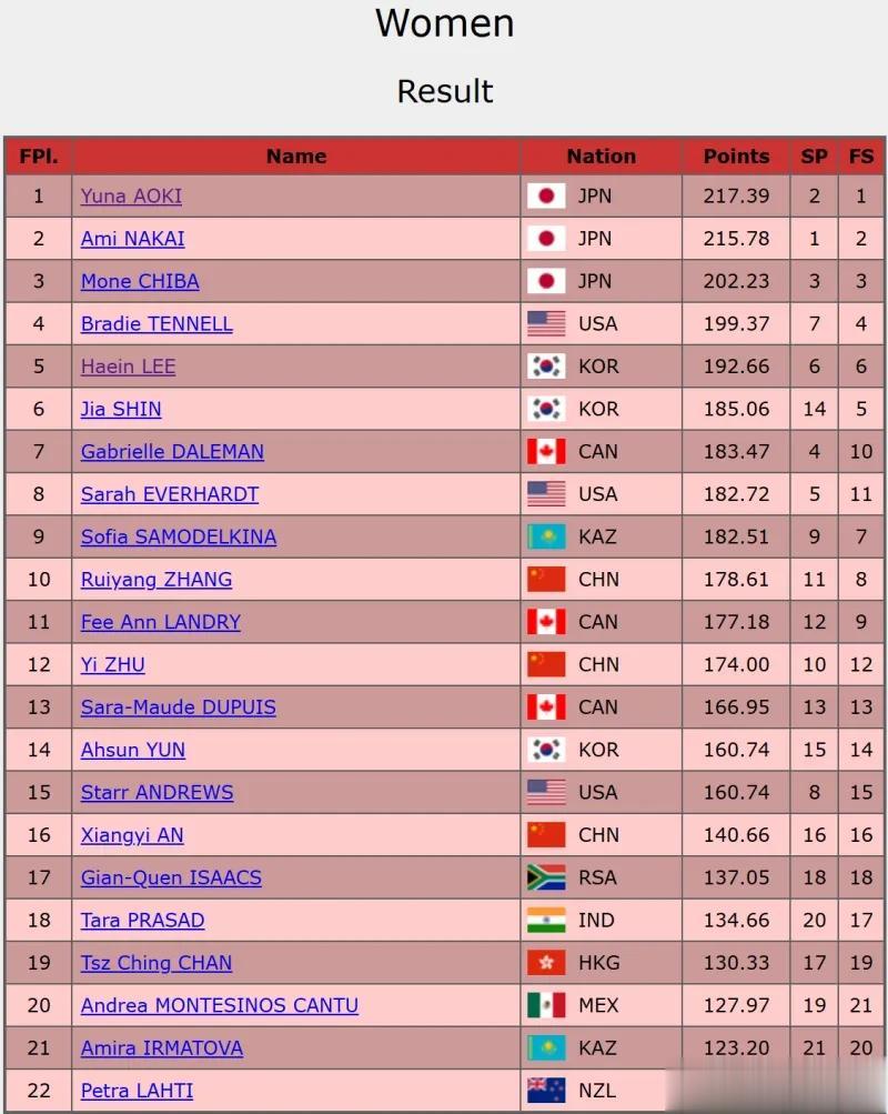 奖牌方面被日本选手包揽,24岁的青木祐奈大幅刷新个人最好成绩,以217.39分夺冠,中井亚美和千叶百音分别以215.78分、208.92分摘得银铜牌。作为冬奥前重要热身赛,张瑞阳的稳定发挥为其备战米兰冬奥会奠定了坚实基础。