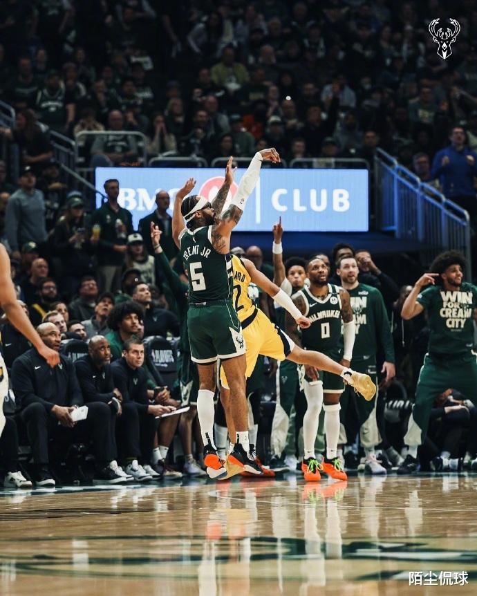 特伦特连续命中6记三分,其中包括3次迎着防守的强投。他的跑动轨迹如同精密计算的导弹路径:借字母哥掩护绕底线接球、反击中追身干拔、底角埋伏接利拉德突分……步行者的防守从错愕到崩溃,分差在单节39-18的冲击波中被彻底逆转。特伦特单节18分的表现不仅追平雷·阿伦的队史纪录,更用9记三分(全场12中9)证明了一个真理:在季后赛的舞台上,小人物也能改写巨星剧本。