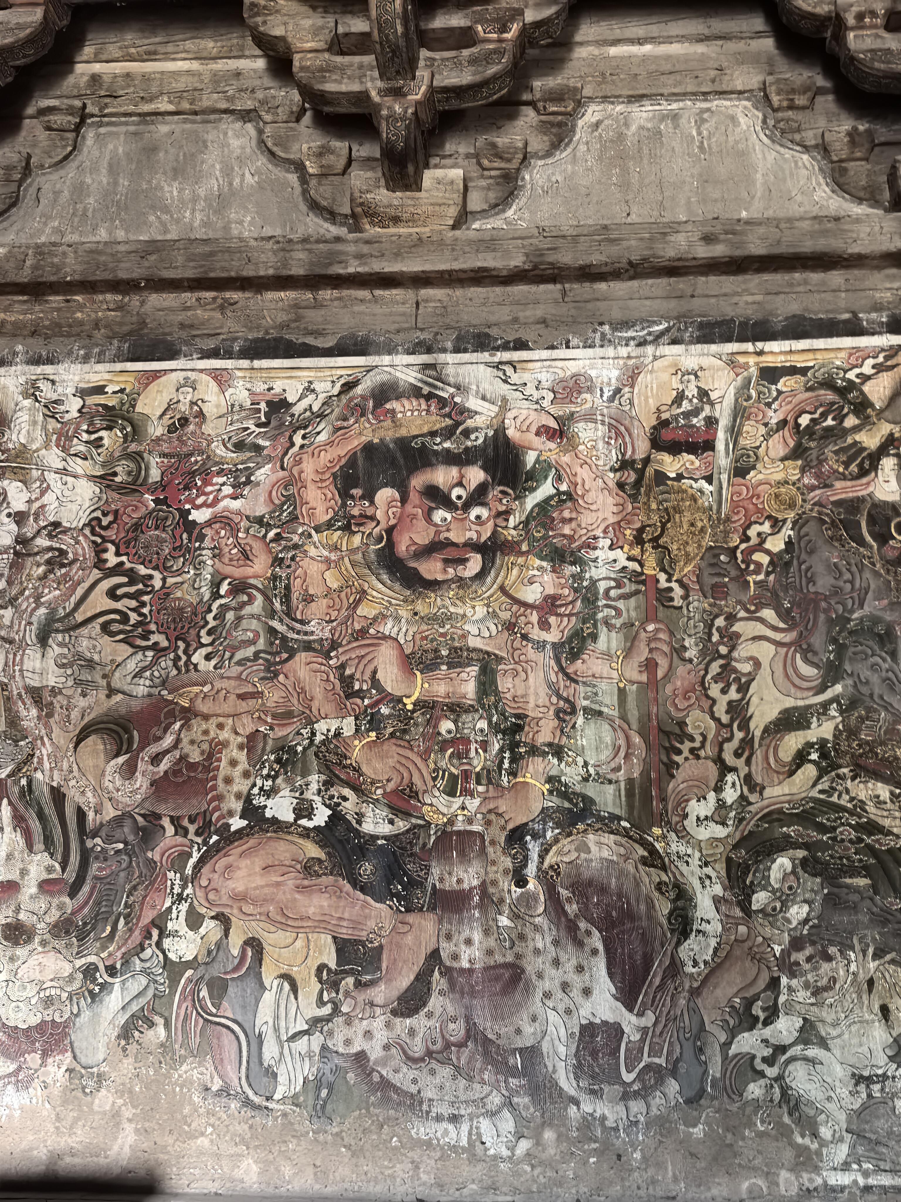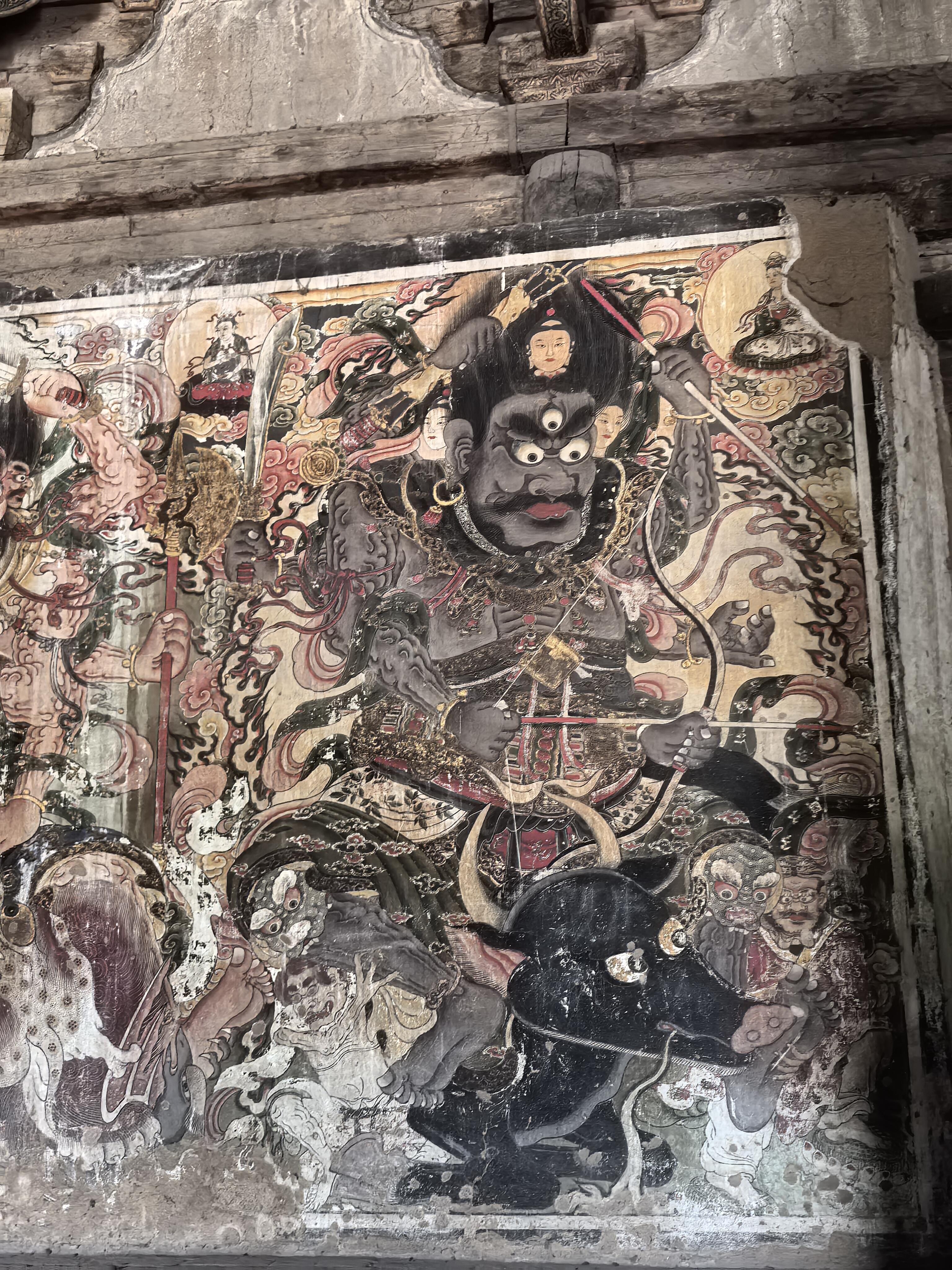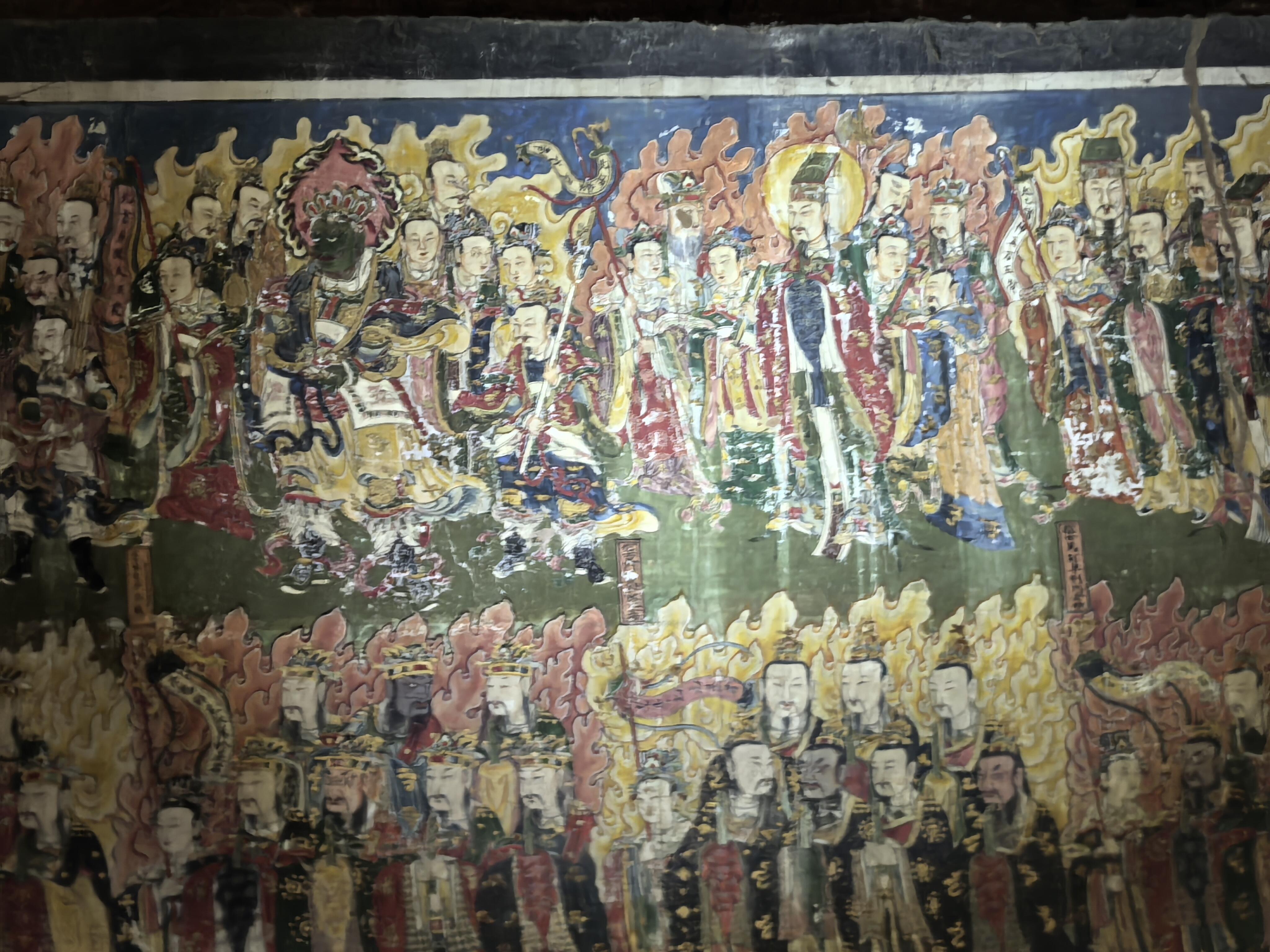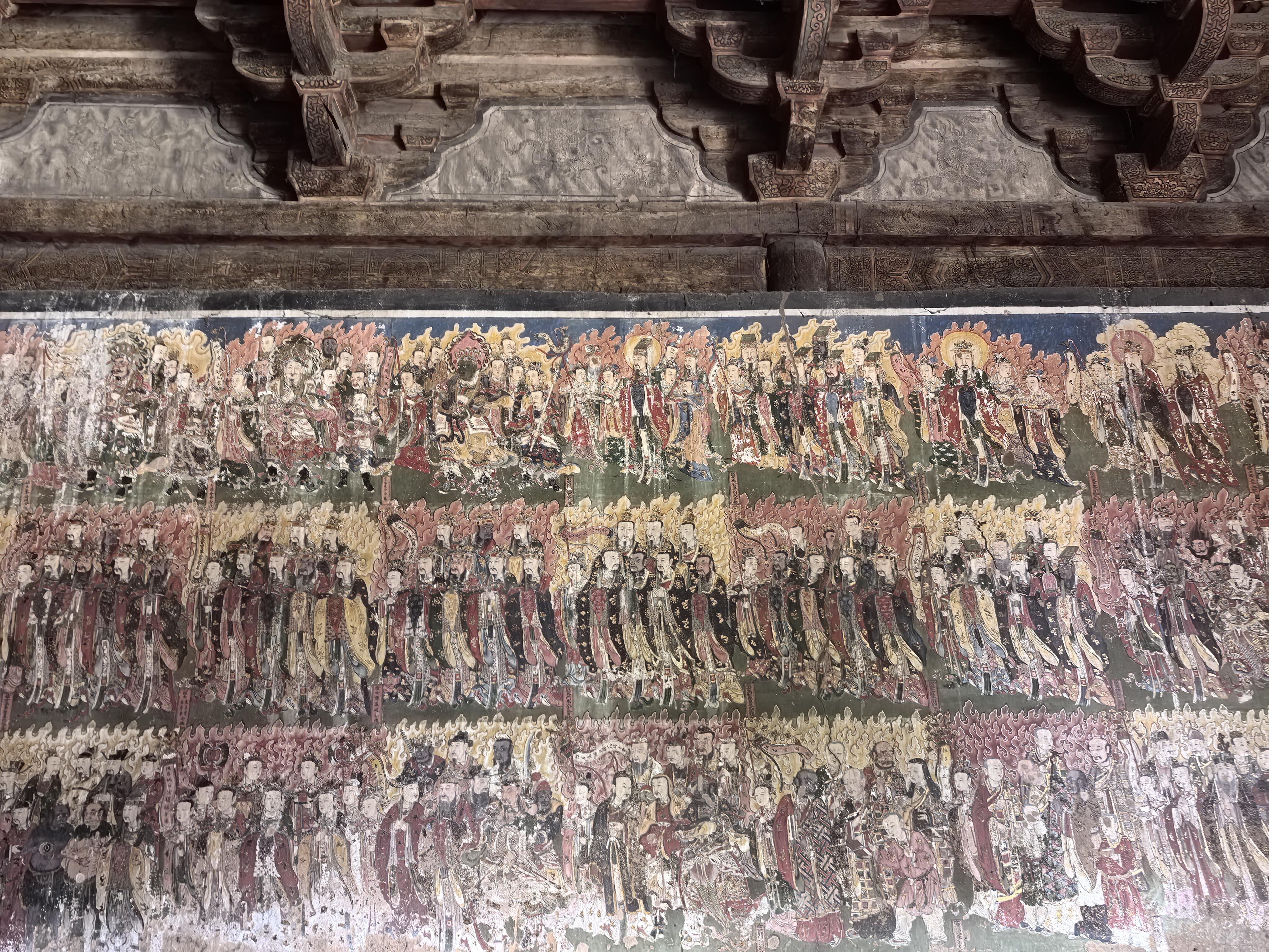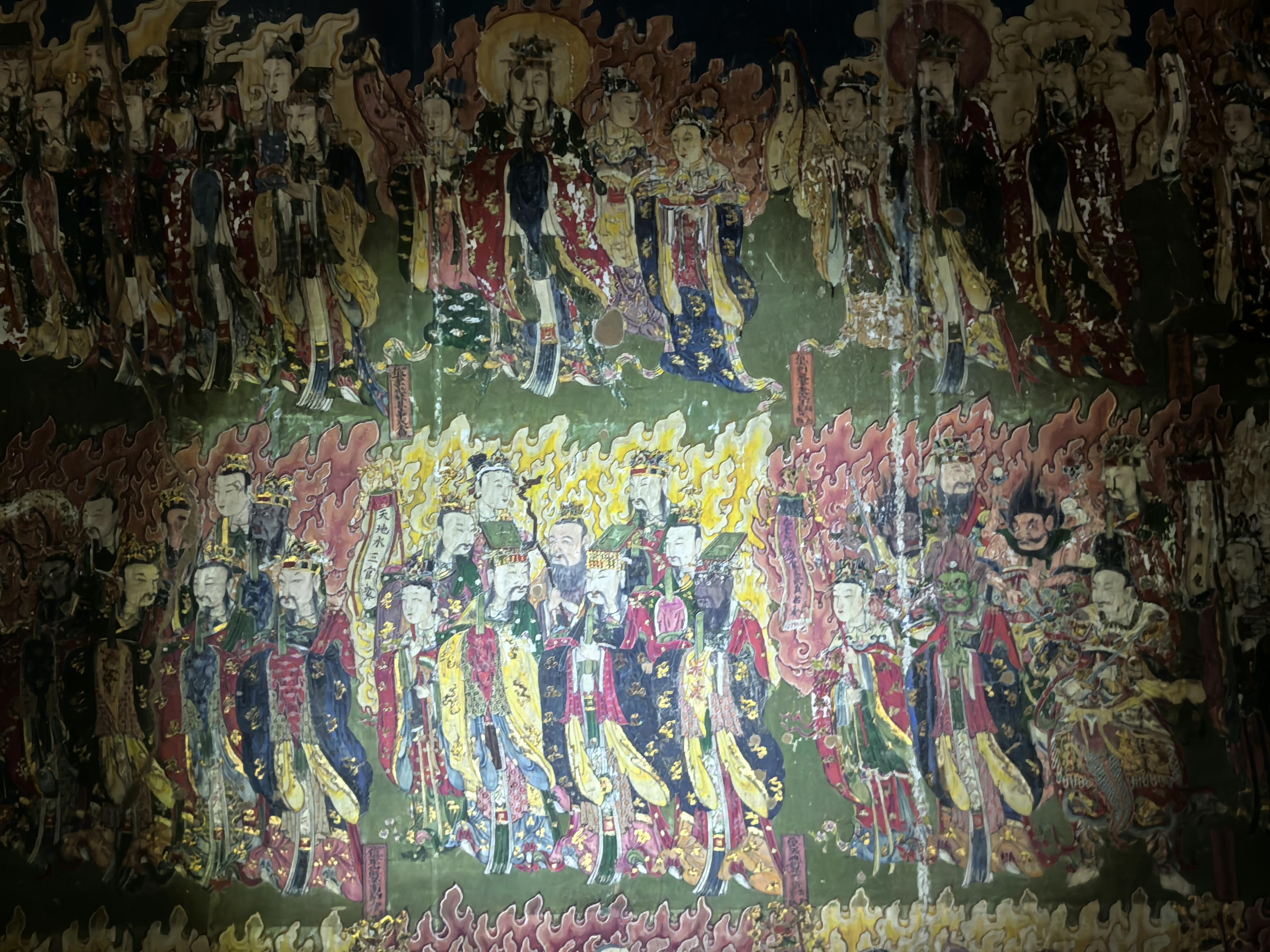 壁画的内容更是包罗万象。儒释道三教的人物共处一墙,孔子与老子并肩而立,佛陀端坐在莲花座上,全然没有教派之争的隔阂。其中最珍贵的当属明王像,这些元代的原作历经风雨,色彩依然浓烈,线条依然流畅。两侧的水路法会图则是明清时期补绘,虽然晚了几百年,却与元代壁画浑然一体,毫无违和感。