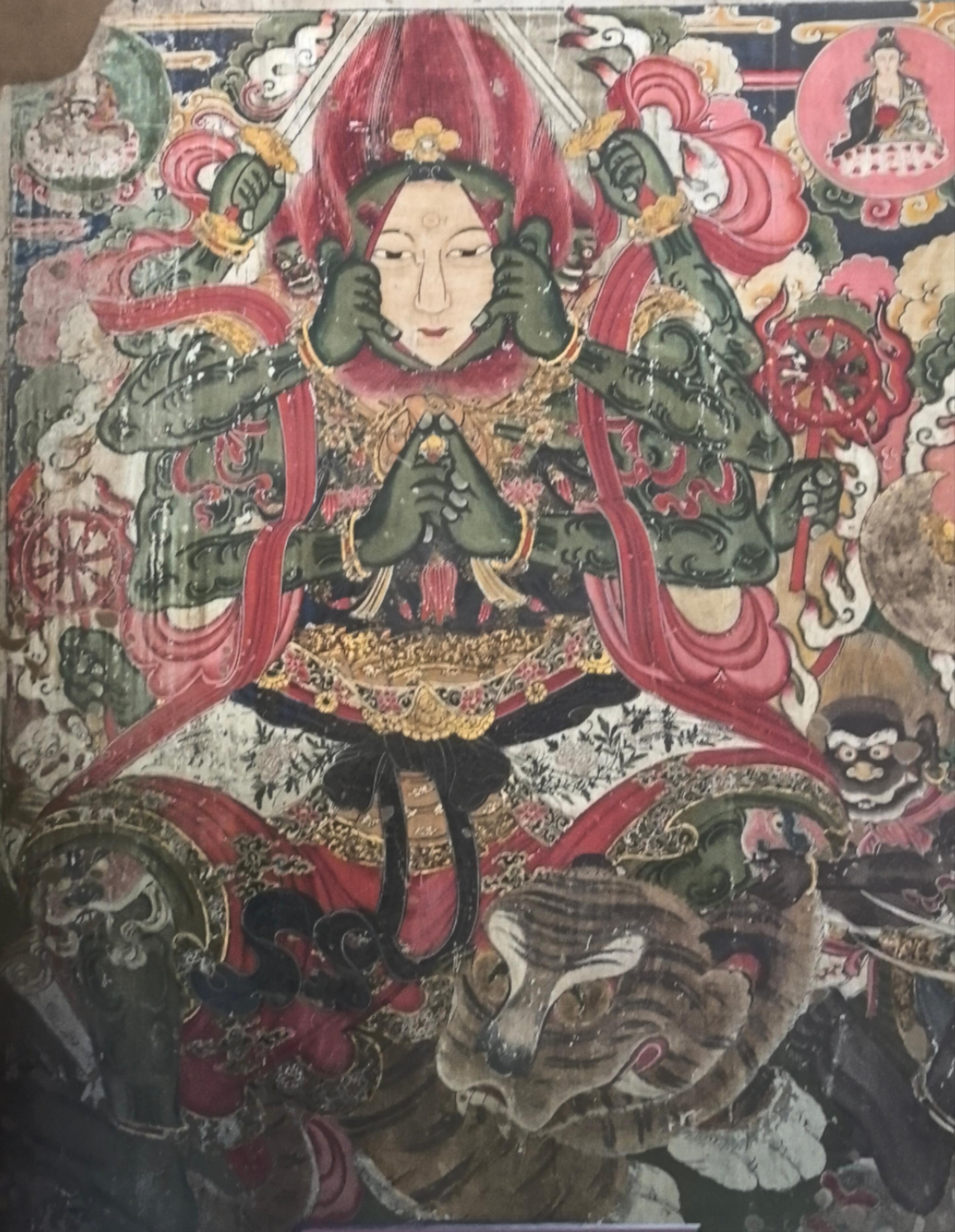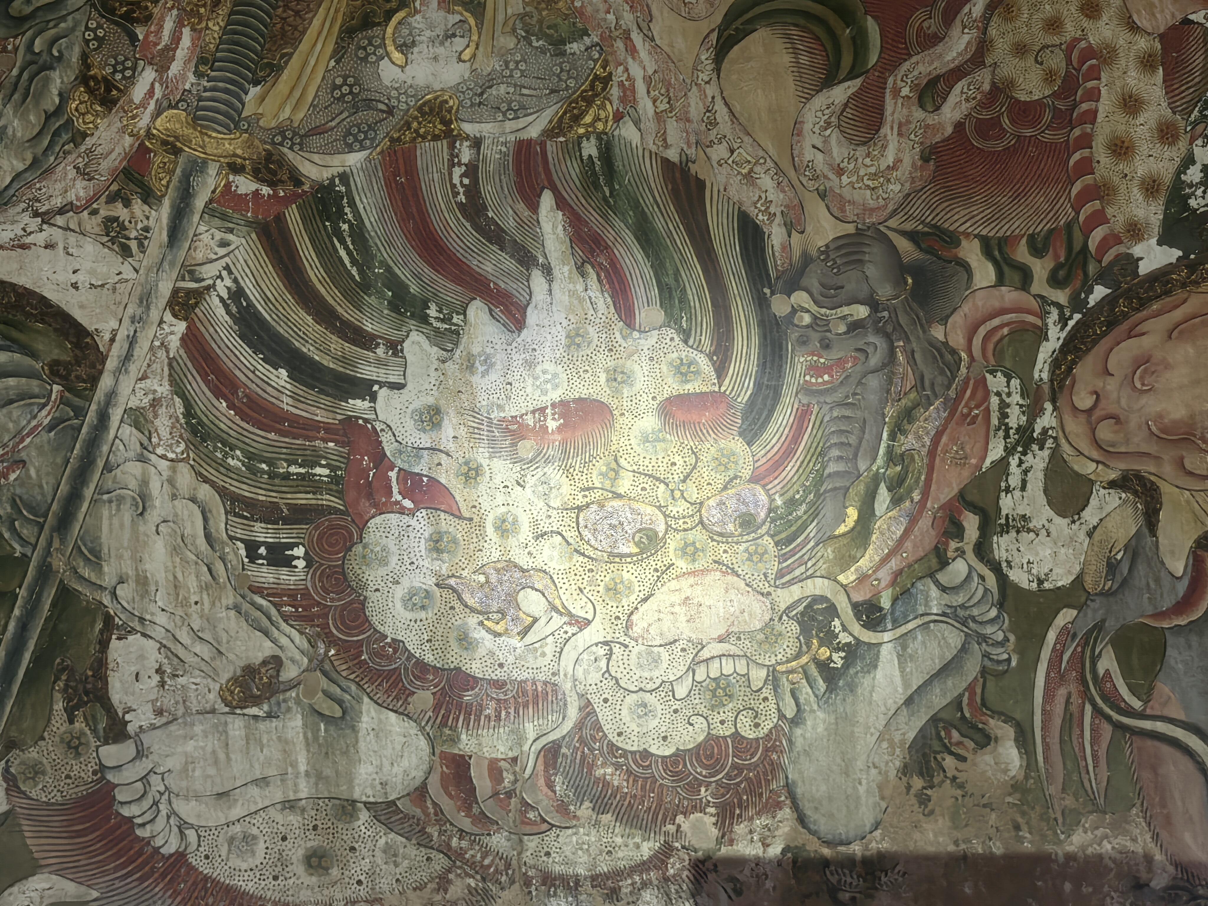 而最震撼的,莫过于满墙的壁画。135组画面,895尊人物,密密麻麻却又井然有序。走近细看,每个人物的表情都不一样:有的慈眉善目,有的怒目圆睁;有的手持法器,有的拈花微笑。这些壁画采用了沥粉贴金的技法,凸起的线条勾勒出衣袂的飘逸,贴金的部分在光线里微微闪烁,让画面有了立体的层次感。