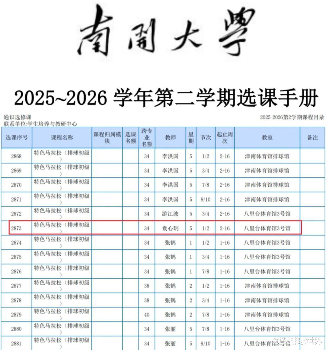根据南开大学发布的选课规定,从2025级本科生起,学生必须修读“身体素质训练类课程”、“特色马拉松类课程”与两门体育专项课,共计4学分,袁心玥即将执教的课程便属于特色马拉松类,说明她的任务不仅是排球教学,更是推动高校体育素养普及的重要角色。