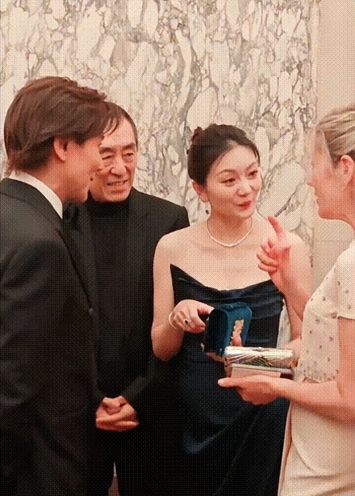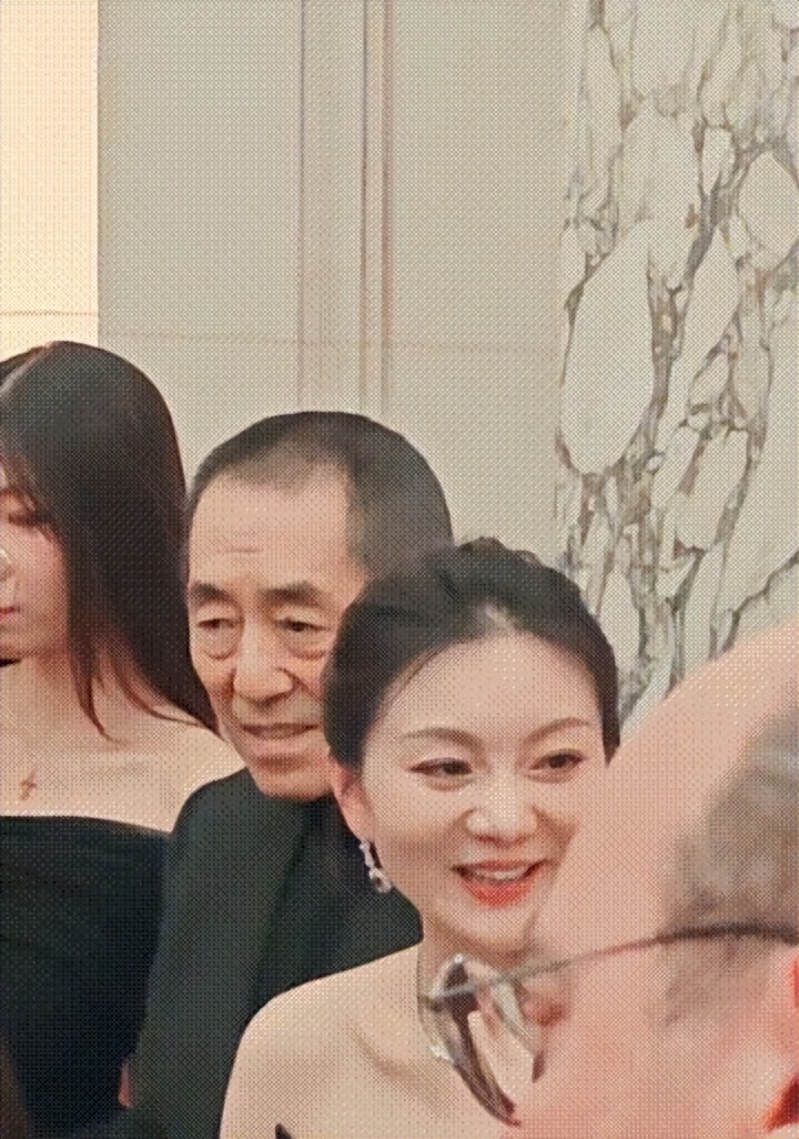 她和张艺谋互动频繁,一会儿说说话,一会儿笑笑,举手投足间都散发着成熟女人的魅力。